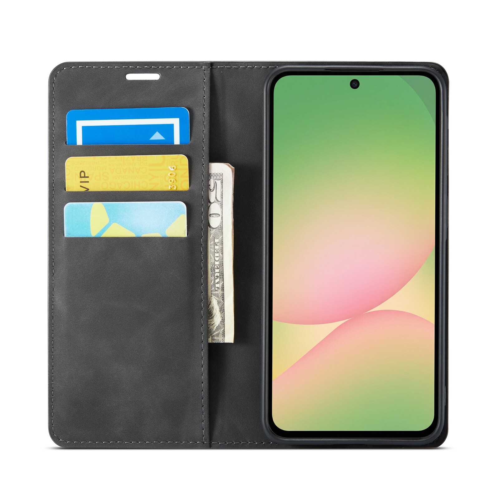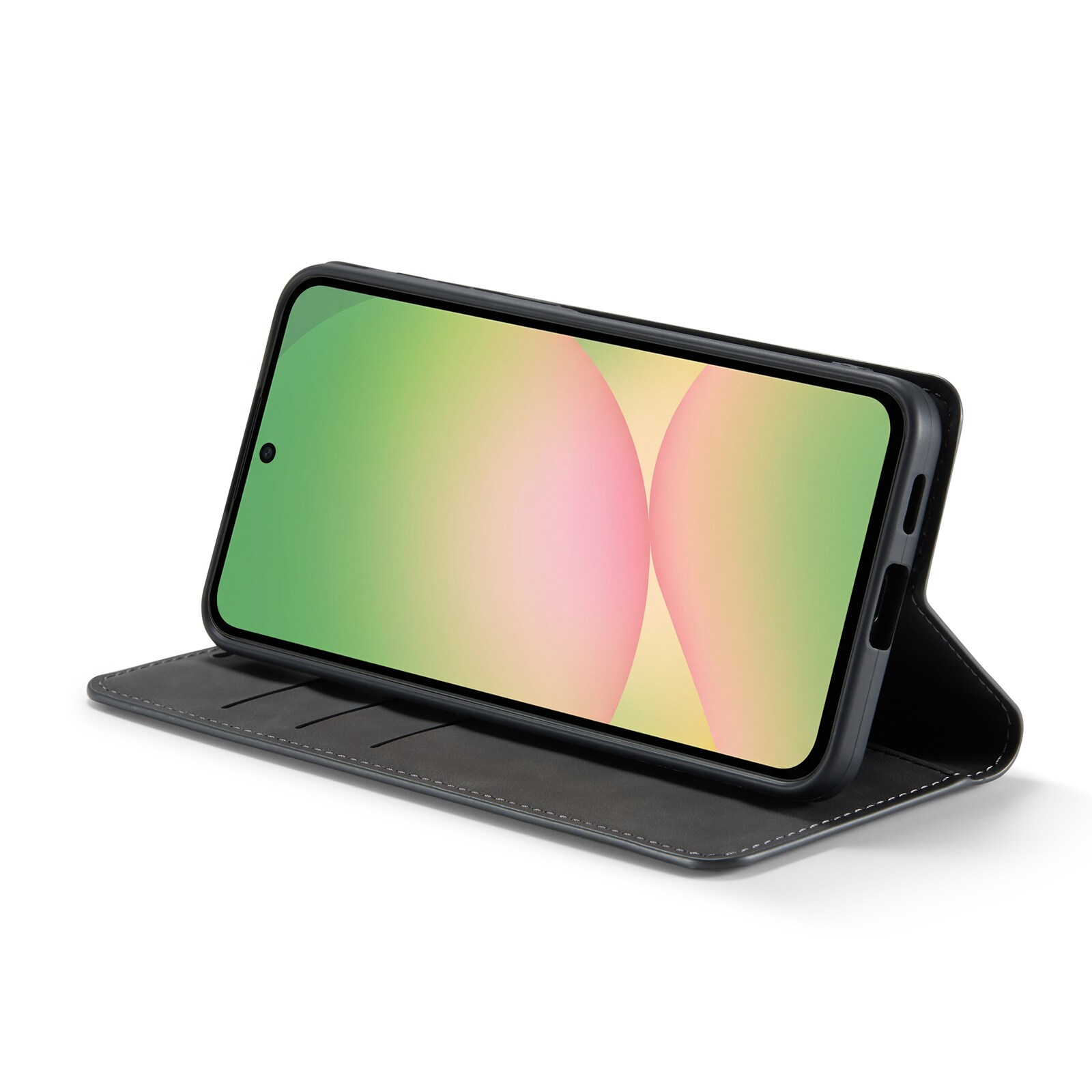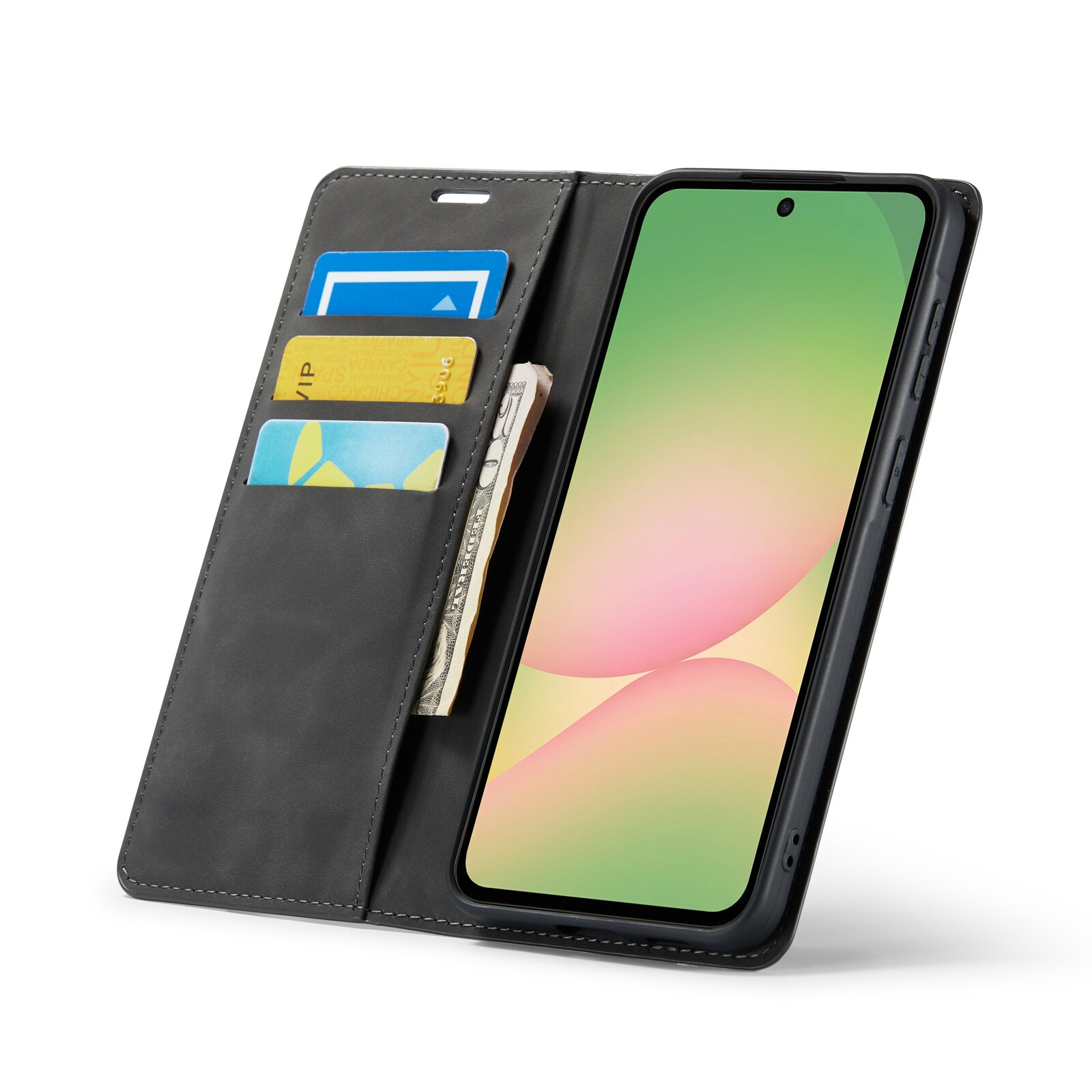 Stilrent och slimmat mobilfodral till Samsung Galaxy A57. Fodralet har ett silkeslent omslag som har tillverkats av hållbart konstläder och ett inbyggt skal som tillverkats av stötdämpande TPU. Locket ger ett utmärkt skydd mot repor på skärmen och det inbyggda skalet skyddar bra vid stötar och fall.