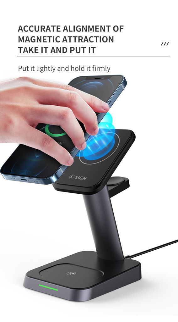 SiGNs 3-in-1 trådlösa MagSafe laddningsstation 15W är en praktisk och platsbesparande lösning för att ladda din mobiltelefon, Apple Watch och AirPods samtidigt. Den magnetiska MagSafe-kompatibla designen säkerställer stabil och säker laddning för kompatibla smartphones, samtidigt som den ger enkel placering och optimal laddningsposition.