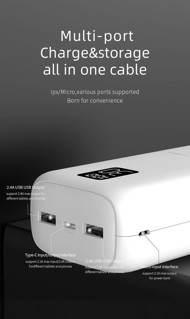Powerbanken är utrustad med en USB-C-port och två USB-A-portar, vilket ger dig flexibilitet att ladda flera enheter samtidigt. USB-A-portarna stöder upp till 2.4A för snabb och effektiv laddning av din mobiltelefon eller surfplatta. Powerbanken kan dessutom laddas via både USB-C och Micro-U... Read more