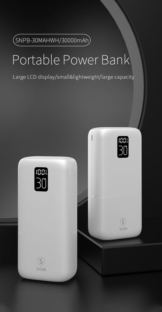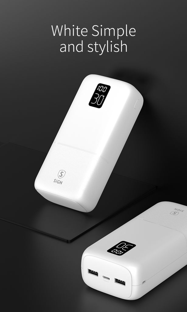 SiGN - Powerbank 30000 mAh Trippel Utgång 2x USB-A + 1x USB-C Vit