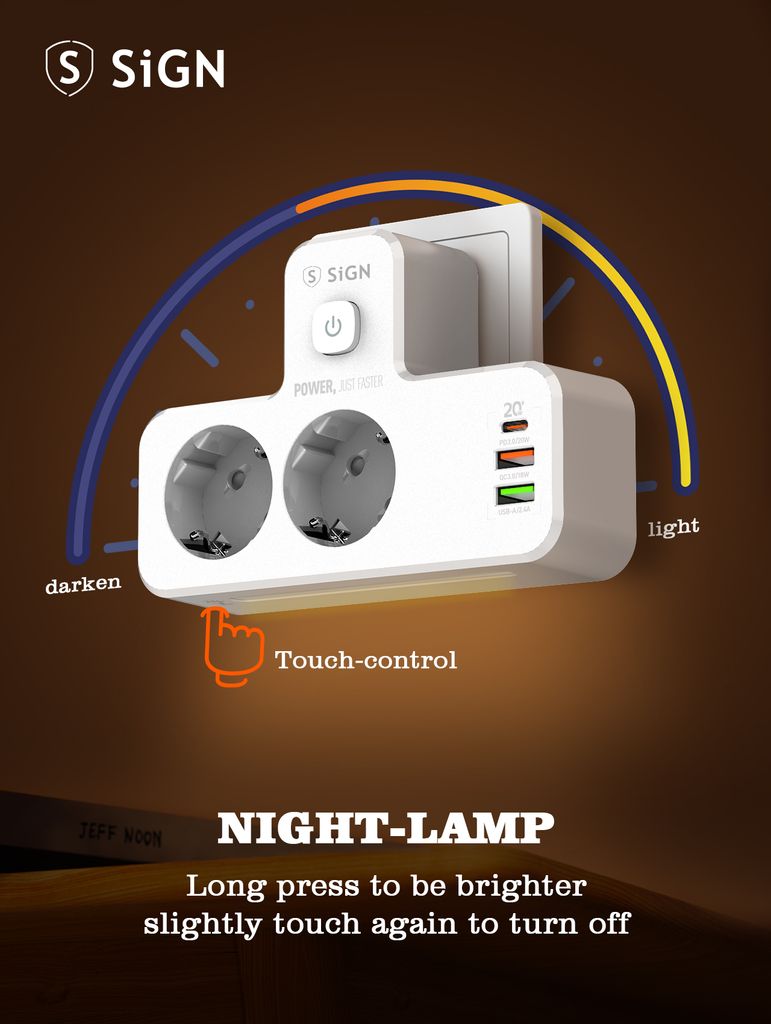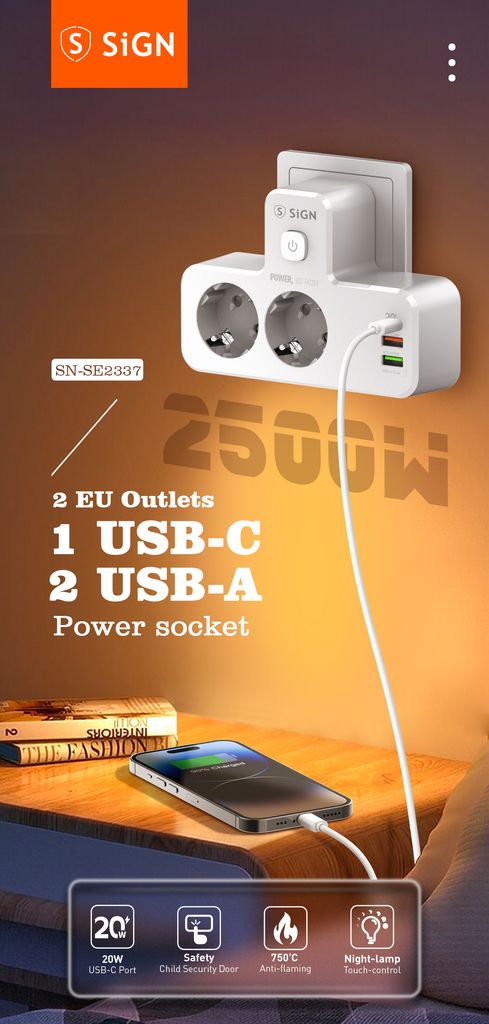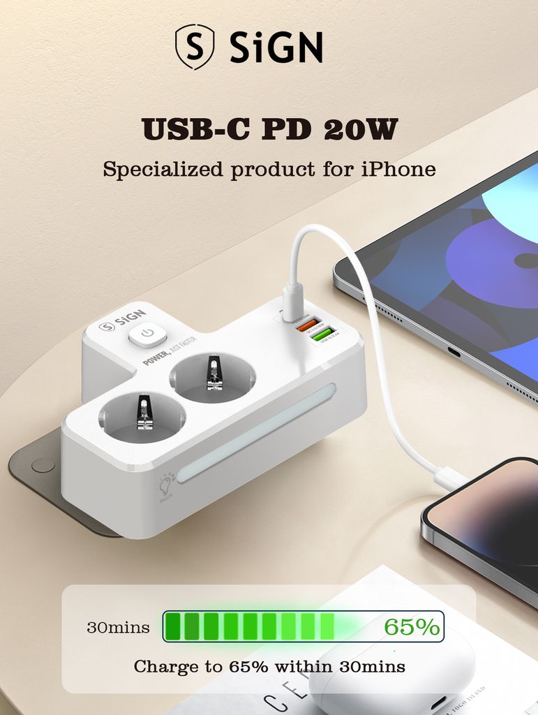 618202-vägs Grenuttag med LED-nattlampa + 1x USB-C + 2x USB-A Vithttps://www.phonelife.eu/chargers-cables/accessories-for-chargers-cables/2-vags-grenuttag-med-led-nattlampa-1x-usb-c-2x-usb-a-vit?channelCountry=IEhttps://www.phonelife.eu/pub_images/original/0_-_-_5_-_-_SE2337_E6_BF_80_E5_85_89_E5_9B_BE_20_286_29_281_29_QMx9by-hIh549xLBT8Lr0.jpgInStock219EUR/chargers-cables/accessories-for-chargers-cablesSiGN<p>SiGN 20W grenuttag med LED-nattlampa är en smart och platsbesparande lösning för både ström och laddning i hem och kontor. Med två AC-strömuttag, två USB-A-portar och en USB-C-port kan du ansluta och ladda flera enheter samtidigt. Perfekt för mobiltelefoner, surfplattor och andra USB-enheter. Den inbyggda LED-nattlampan ger ett mjukt och behagligt ljus som passar utmärkt i sovrum, hall eller vid sängen. Med stöd för Power Delivery och Quick Charge levererar USB-C-porten upp till 20W för effektiv snabbladdning. Grenuttaget kombinerar hög funktionalitet med kompakt design och är anpassat för daglig användning.</p>