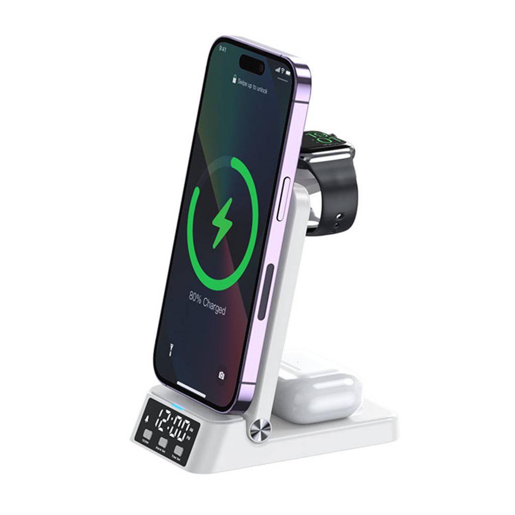 SiGN 3-in-1 trådlösa laddningsställ med väckarklocka 15W är en praktisk och platsbesparande lösning för att ladda din smartphone, Apple Watch och trådlösa hörlurar samtidigt. Den integrerade digitala klockan med alarmfunktion gör laddningsstationen idealisk för nattduksbordet eller skrivbordet, där du enkelt kan hålla både dina enheter och tiden under kontroll.