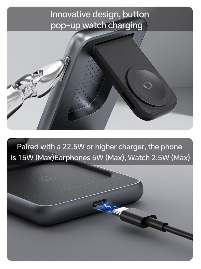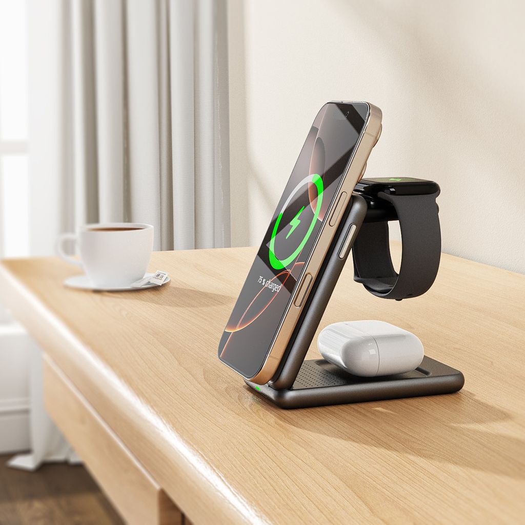 NEXTBATTs 3-i-1 hopfällbara trådlösa magnetiska laddningsstation 15W är en praktisk och kompakt lösning för att ladda din smartphone, Apple Watch och trådlösa hörlurar samtidigt. Den vikbara designen gör laddningsstationen enkel att ta med på resor eller använda både hemma och på kontoret, samtidigt som den sparar plats på skrivbordet.