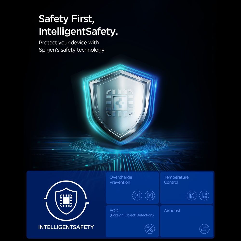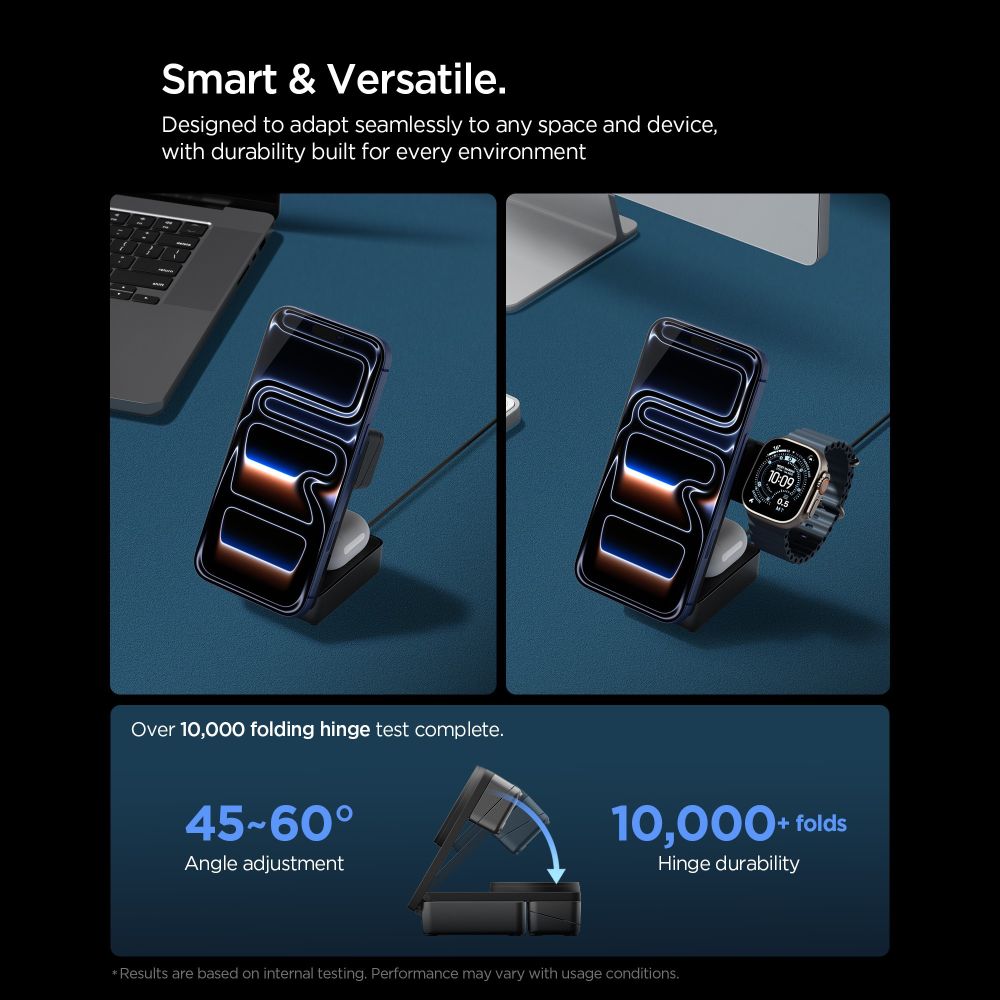 Ladda upp till tre enheter samtidigt med Spigen Essential Qi2.2 3-i-1 trådlösa laddningsstation. Med stöd för Qi2.2 och upp till 25W effekt kan du ladda mobil, smartwatch och trådlösa hörlurar snabbt och smidigt utan kabeltrassel. De starka magneterna säkerställer stabil positionering för MagSafe-kompatibla enheter.