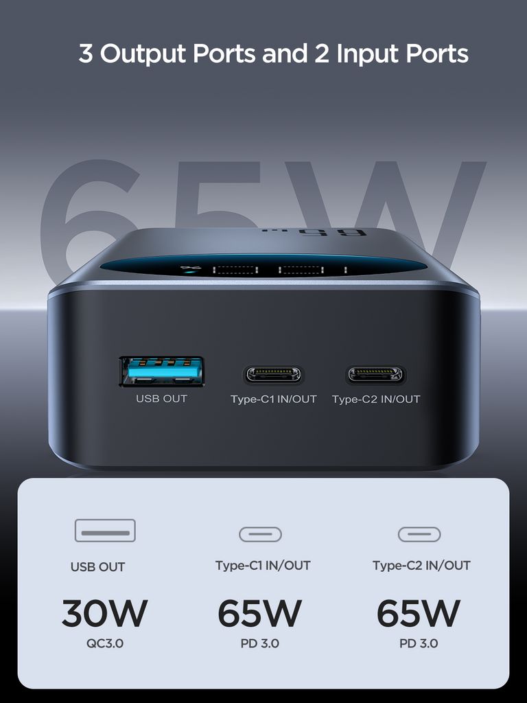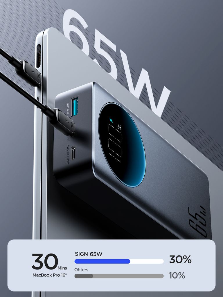 SiGN Powerbank 65W med 30000mAh kapacitet är en kraftfull och flexibel laddningslösning för smartphones, surfplattor, bärbara datorer och andra USB-kompatibla enheter. Med två USB-C-portar och en USB-A-port kan du ladda upp till tre enheter samtidigt, vilket gör den praktisk för både vardag och resor. USB-C-utgången på upp till 65W gör den lämplig för laddning av kompatibla laptops samt andra enheter som kräver högre effekt.