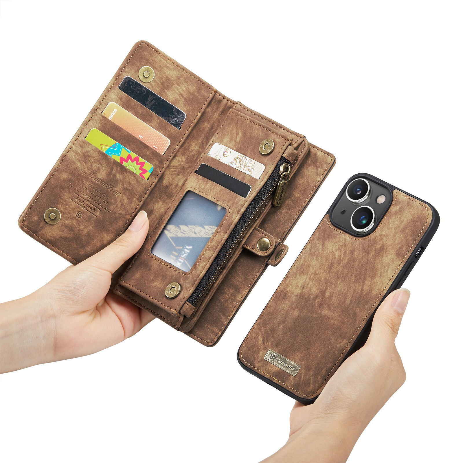 Mobile phone case with magnetic shell and wallet with extra card slots from CaseMe. The spacious wallet has several card slots, a bill pocket, and a zipper coin pocket. The phone is securely held in place and protected in the shock-absorbing magnetic shell, which is removable, allowing you to take it off the case when you are at home, work or traveling.