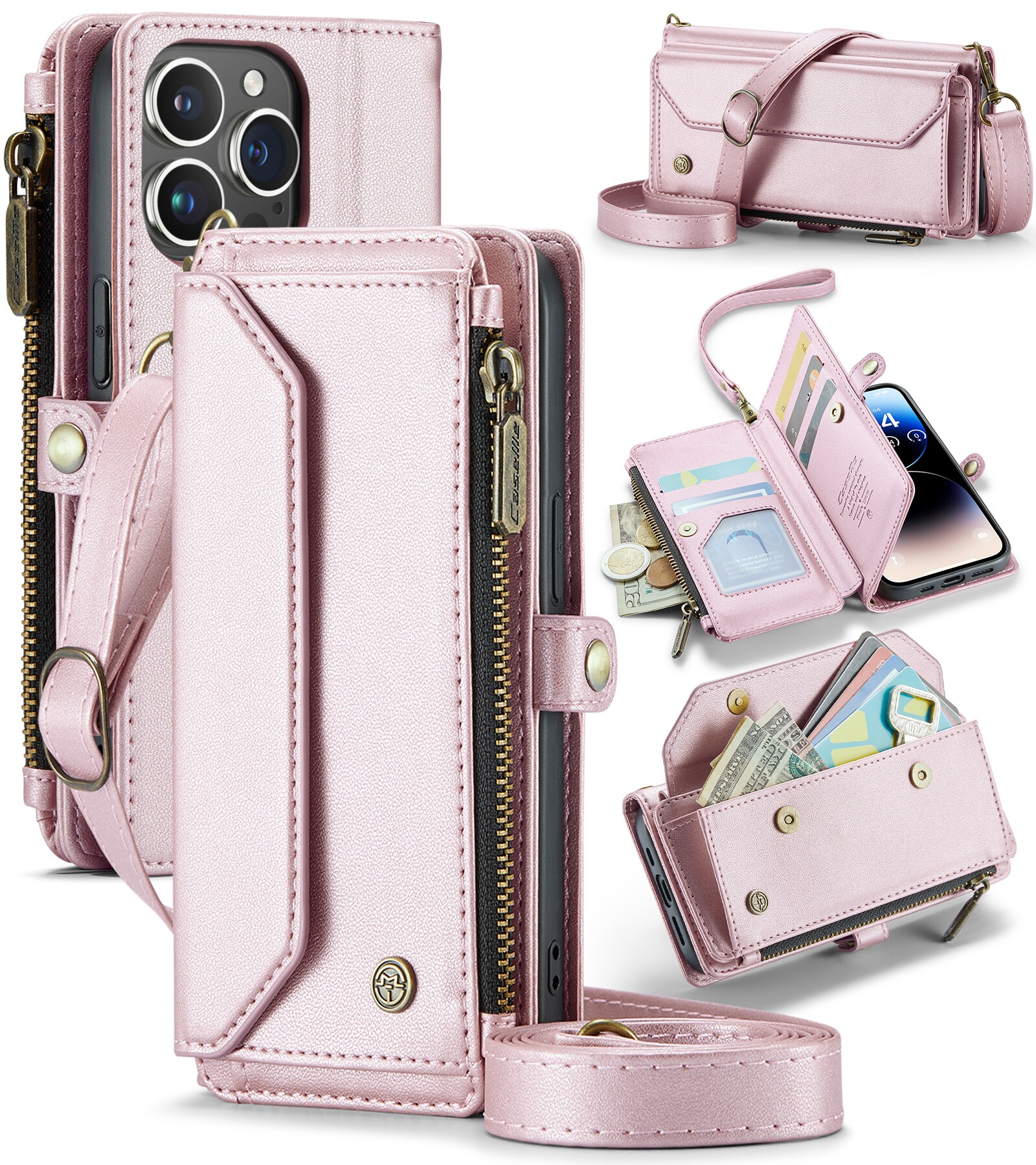 A stylish and practical phone case with a built-in wallet featuring multiple card slots for iPhone 14 Pro from CaseMe. The spacious wallet includes an exterior pocket, a bill compartment, a coin pocket with a zipper, and several card slots. The case can also transform into a stand, making it easy to enjoy hands-free viewing of your phone.