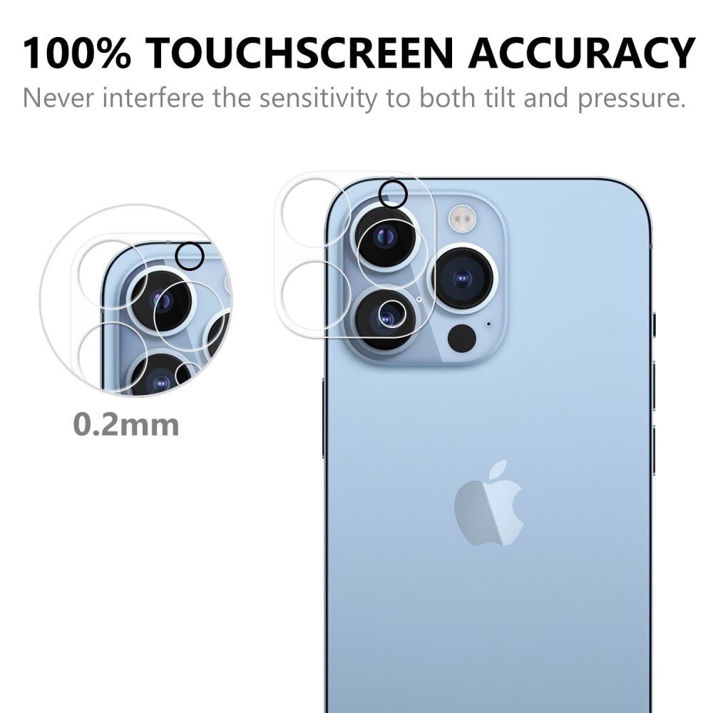 Camera lens protector in durable tempered glass for Apple [MODEL]. Protects the camera lens against scratches and damage so that you can take sharp pictures for a long time. When the protector is applied to the camera, it is barely visible. The protection is full coverage, meaning it covers the entire camera housing and the lenses.
