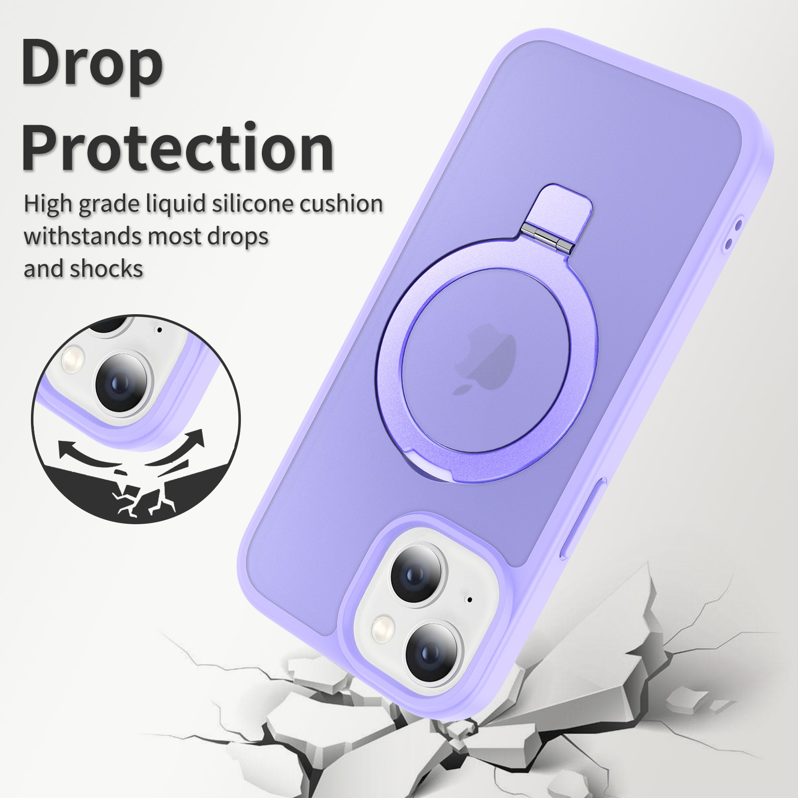 Mobilskal med utfällbar magnetisk ring till Apple iPhone 14. För bästa skydd mot stötar och fall är skalet tvådelat med en TPU-kärna och ett hölje i hårdplast. Ringen på baksidan är magnetisk och kan användas tllsammans med MagSafe-kompatibla tillbehör såsom laddare och korthållare. Ringen kan även bilda ett ställ för att se på film, klipp eller för att spela.
