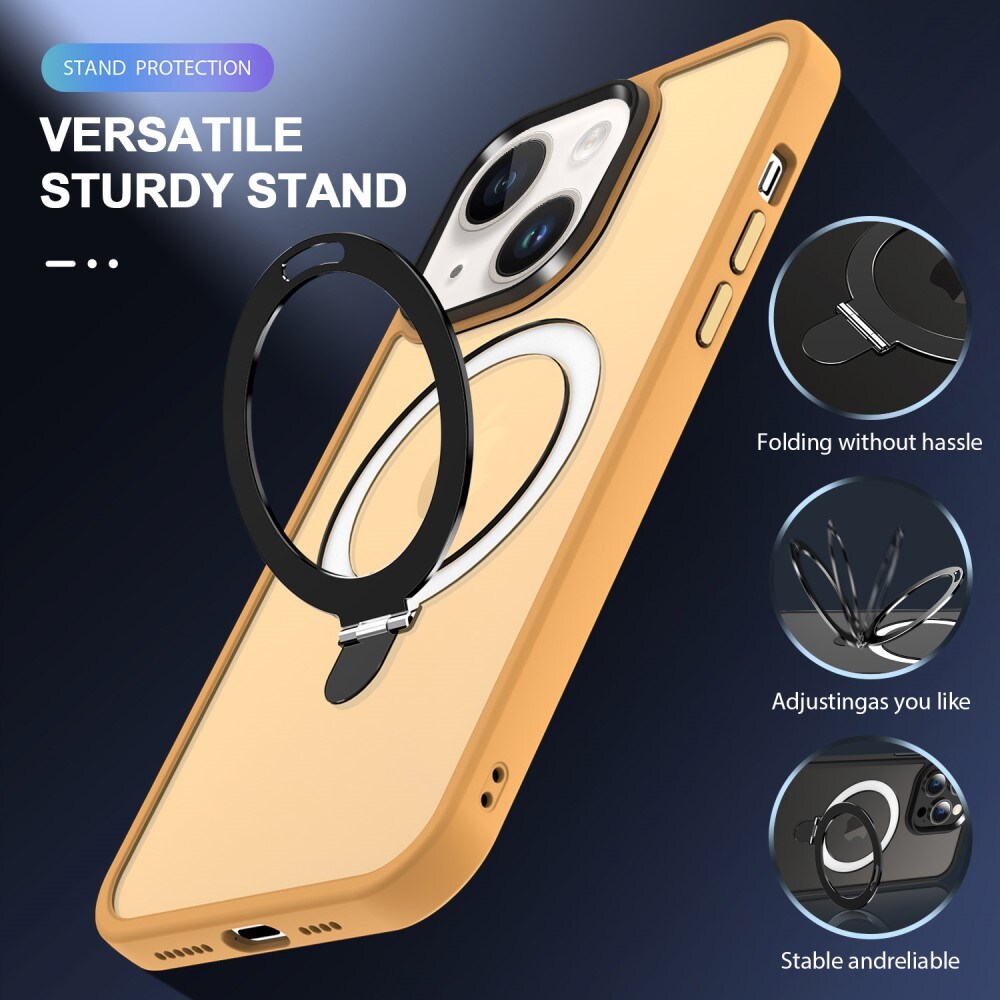 Hybrid case with foldable magnetic ring for Apple iPhone 14. For optimal protection against drops and impacts, the case features a dual-layer design with a TPU core and a hard plastic outer shell. The ring on the back is magnetic and compatible with MagSafe accessories such as chargers and card holders. It can also be used as a stand for watching movies, videos, or gaming.