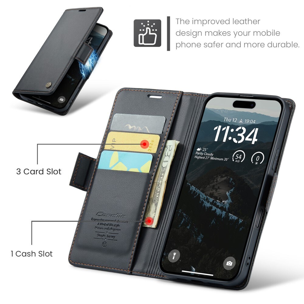 Slim and practical wallet case with RFID protection from CaseMe for Apple iPhone 16 Plus. The case provides all-around protection for your phone without compromising on style. The front cover stays closed with hidden magnets, giving the case a sleek design that doesn't make your phone bulky. With RFID protection, you can feel confident that your cards are safely stored inside the wallet case.