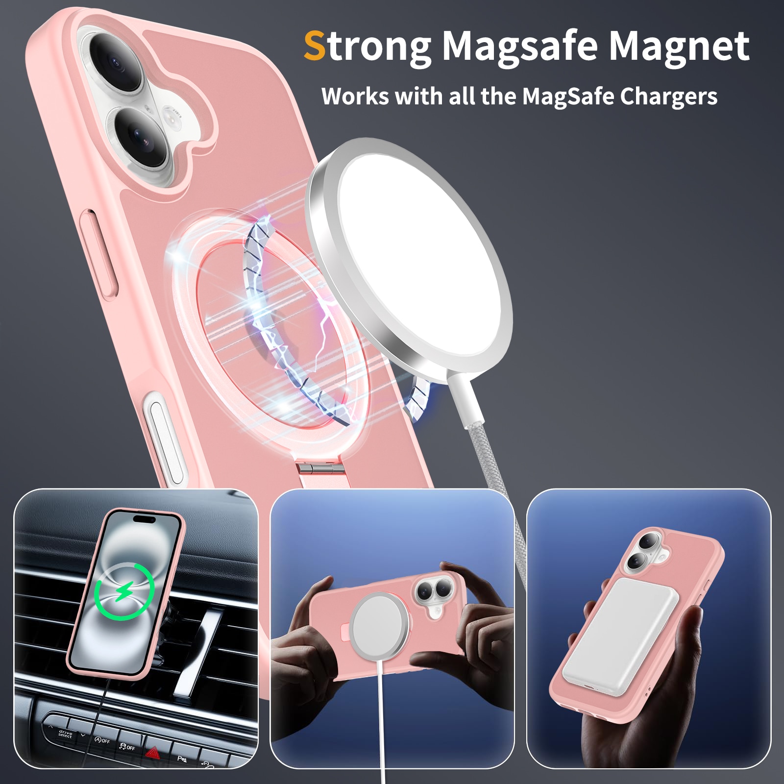 Mobilskal med utfällbar magnetisk ring till Apple iPhone 16. För bästa skydd mot stötar och fall är skalet tvådelat med en TPU-kärna och ett hölje i hårdplast. Ringen på baksidan är magnetisk och kan användas tllsammans med MagSafe-kompatibla tillbehör såsom laddare och korthållare. Ringen kan även bilda ett ställ för att se på film, klipp eller för att spela.
