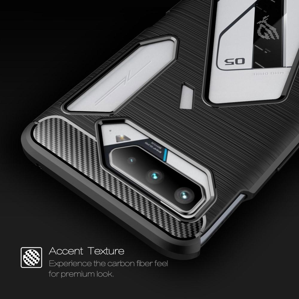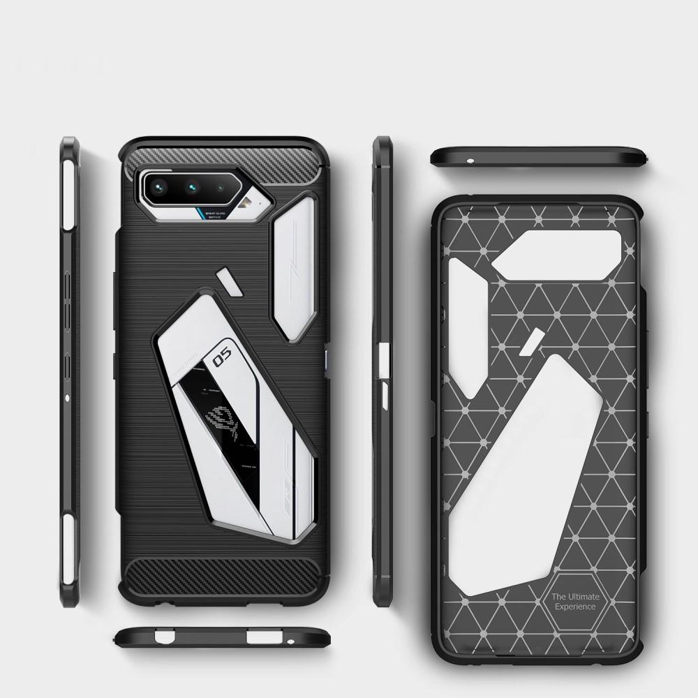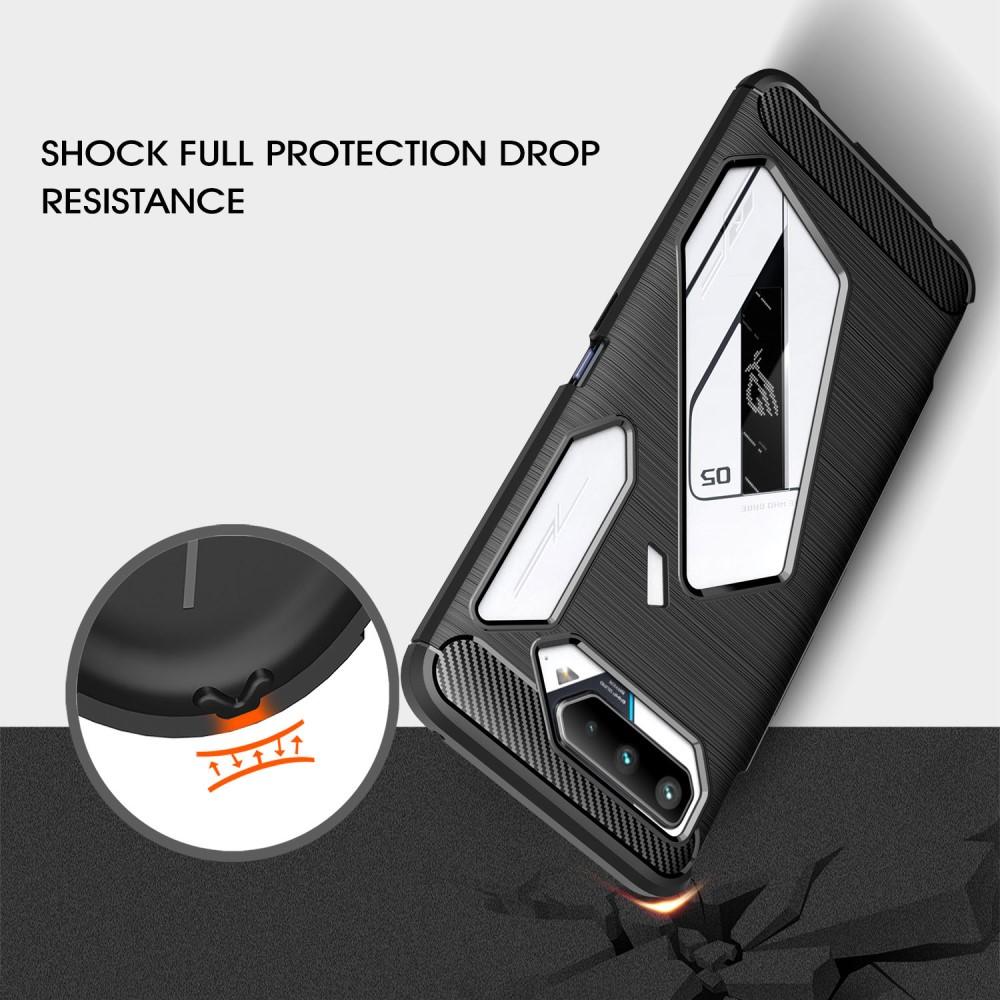 A shock-absorbing TPU case for Asus ROG Phone 5 from tectTech. The case features a sleek design with a brushed back and carbon fiber details. The corners are equipped with air cushions for extra protection against drops and impacts.