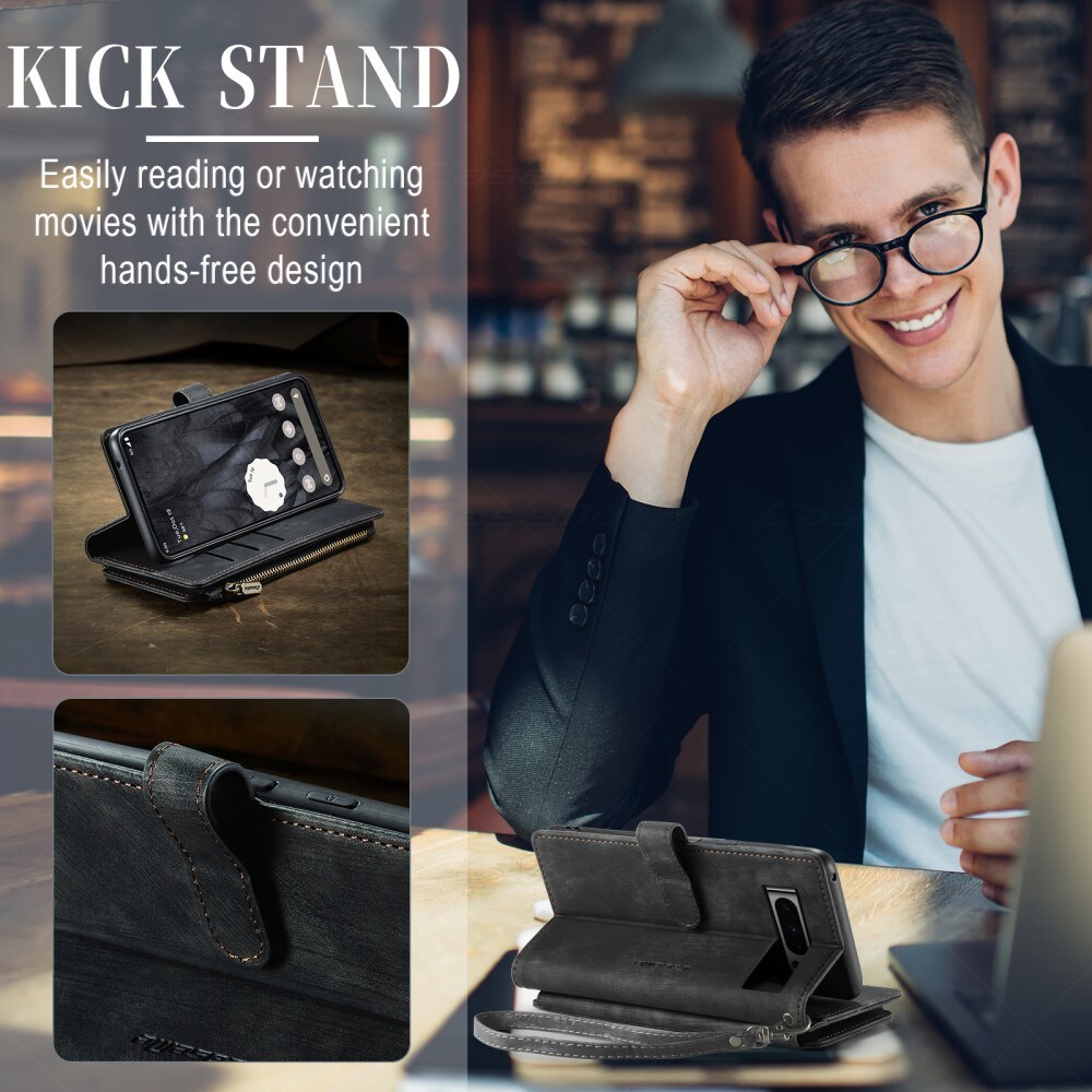 Phone wallet case with an extra spacious wallet and multiple card slots for Google Pixel 8 Pro from CaseMe. The wallet features 7 card slots, a bill compartment, and a roomy coin pocket with a zipper.