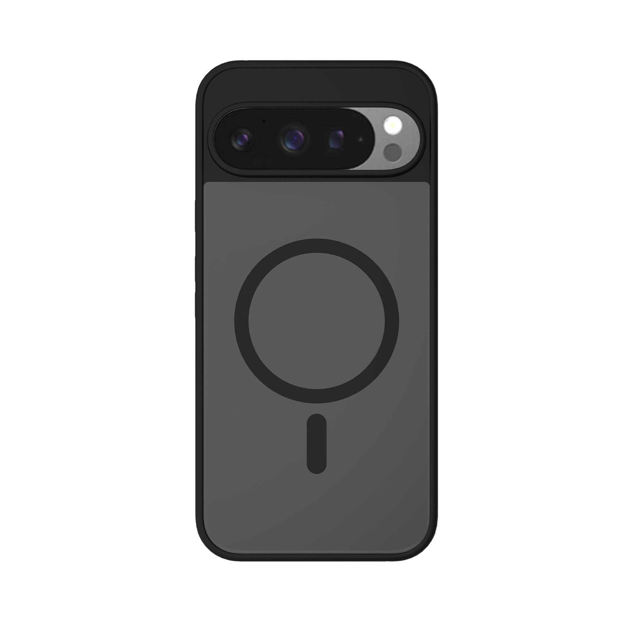 Hybrid case with magnetic ring for Google Pixel 9 Pro XL from Mobique. The case features a sleek frosted finish and is equipped with a magnetic ring on the back. The ring allows seamless compatibility with MagSafe accessories such as chargers and card holders.