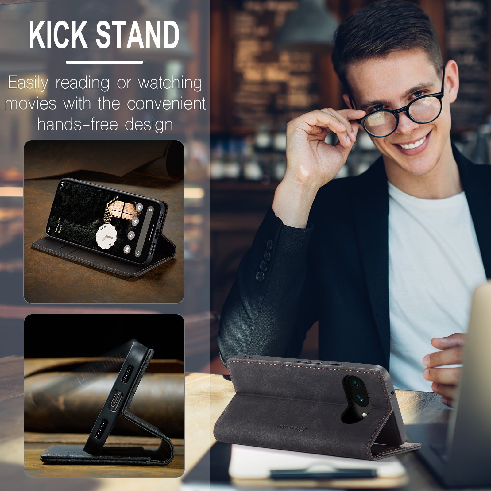 Plånboken på insidan av locket rymmer dina kort och det finns en ficka för sedlar eller kvitton. Vill du se på film eller serier kan du enkelt vika fodralet till ett mobilställ.