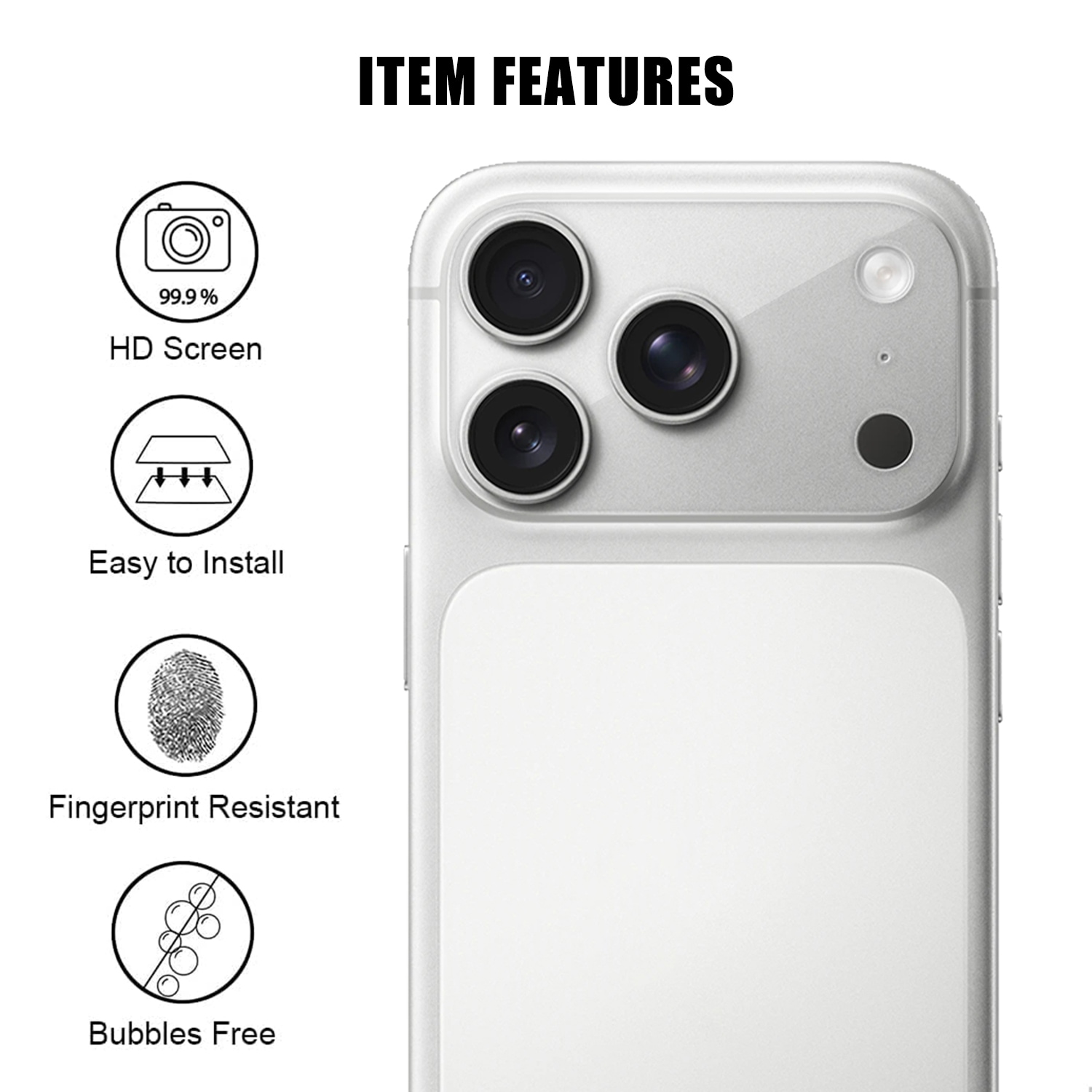 Kameralinsskydd i härdat glas till Apple iPhone 17 Pro, utformat för att skydda kameramodulen mot repor, stötar och yttre slitage. Skyddet är heltäckande och täcker både linser och kamerahus. När skyddet är monterat är det diskret och påverkar inte telefonens utseende.