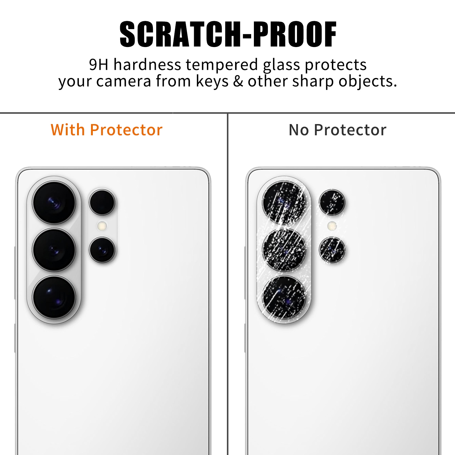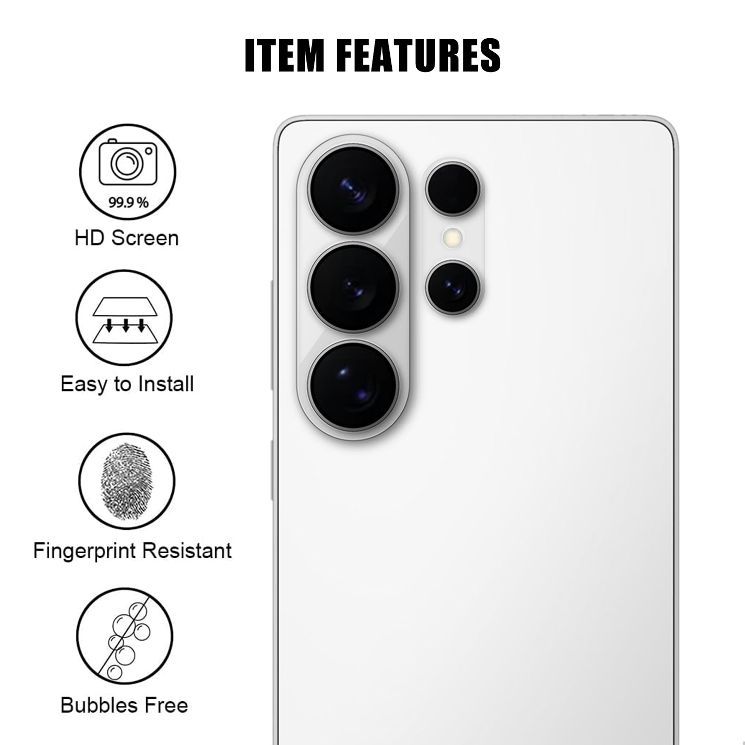 Kameralinsskydd i härdat glas till Samsung Galaxy S26 Ultra, utformat för att skydda kameramodulen mot repor, stötar och yttre slitage. Skyddet är heltäckande och täcker både linser och kamerahus. När skyddet är monterat är det diskret och påverkar inte telefonens utseende.