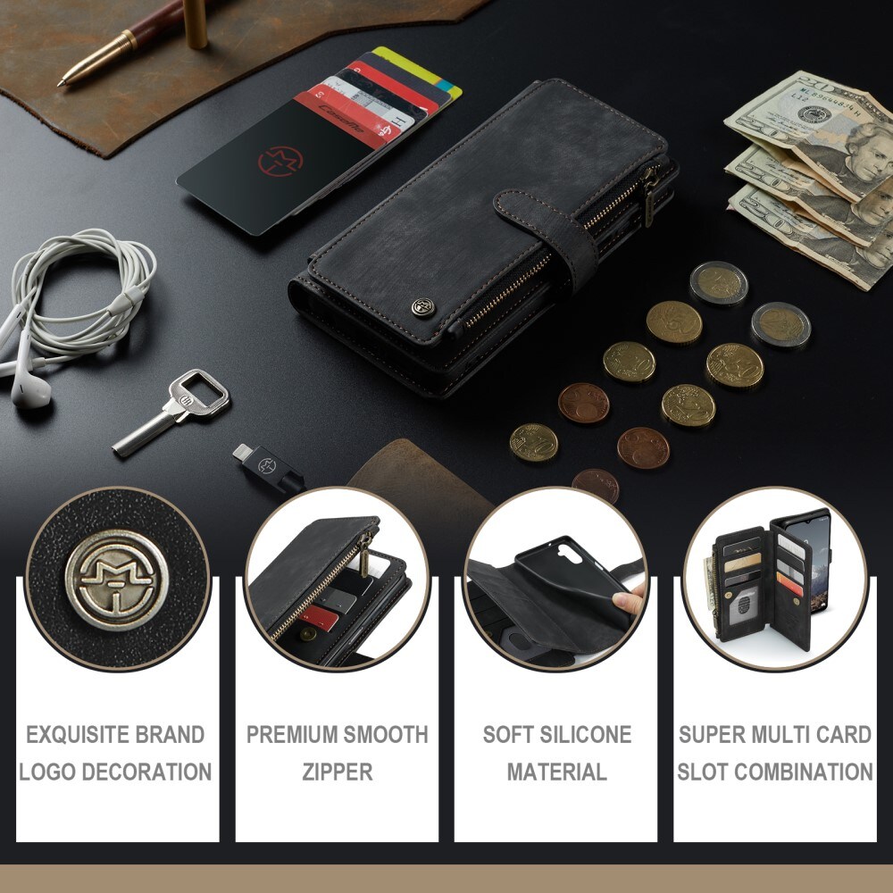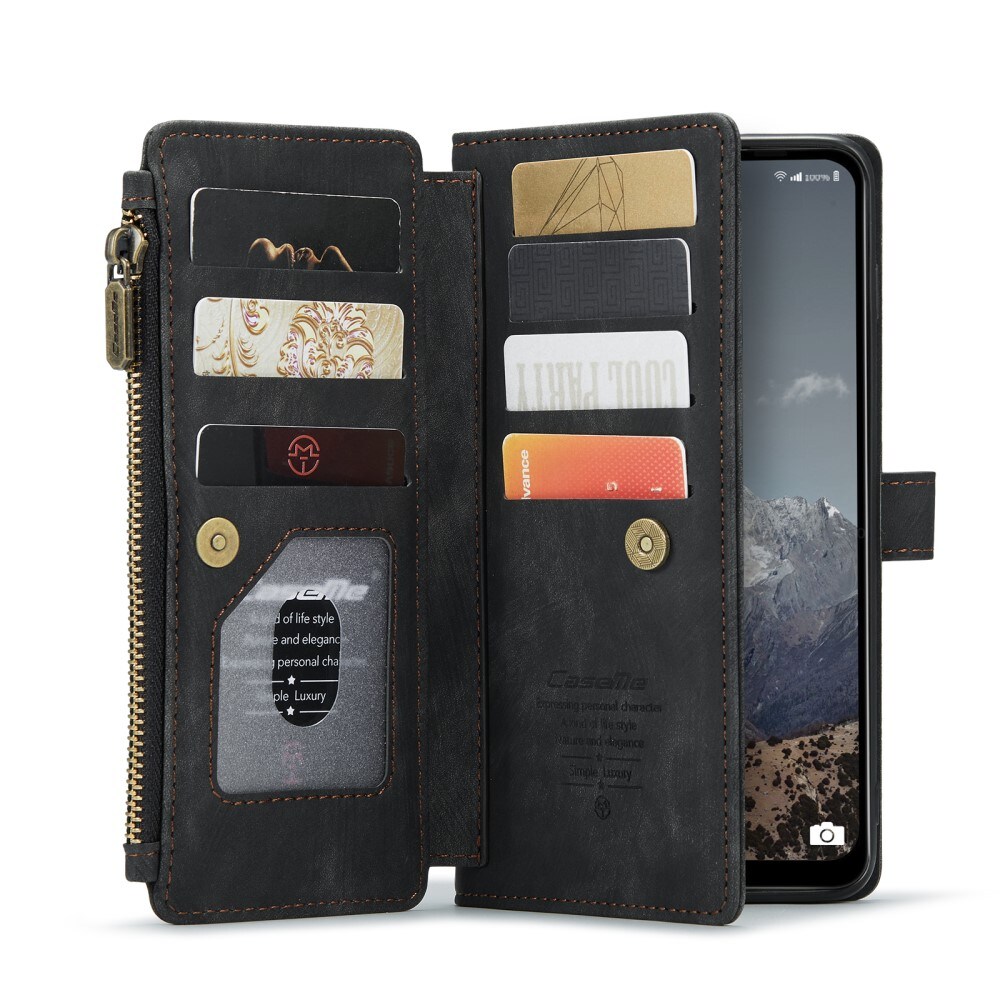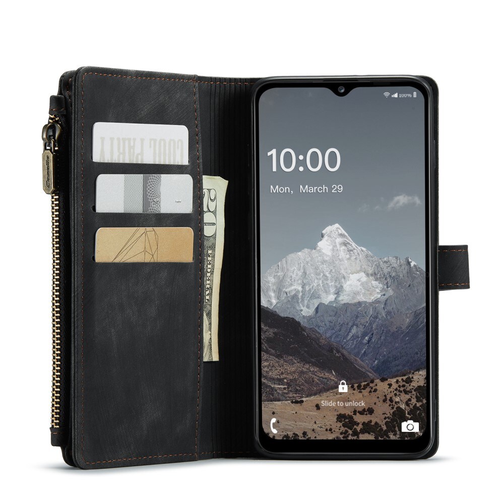 Phone wallet case with an extra spacious wallet and multiple card slots for Samsung Galaxy A04s from CaseMe. The wallet features 7 card slots, a bill compartment, and a roomy coin pocket with a zipper.