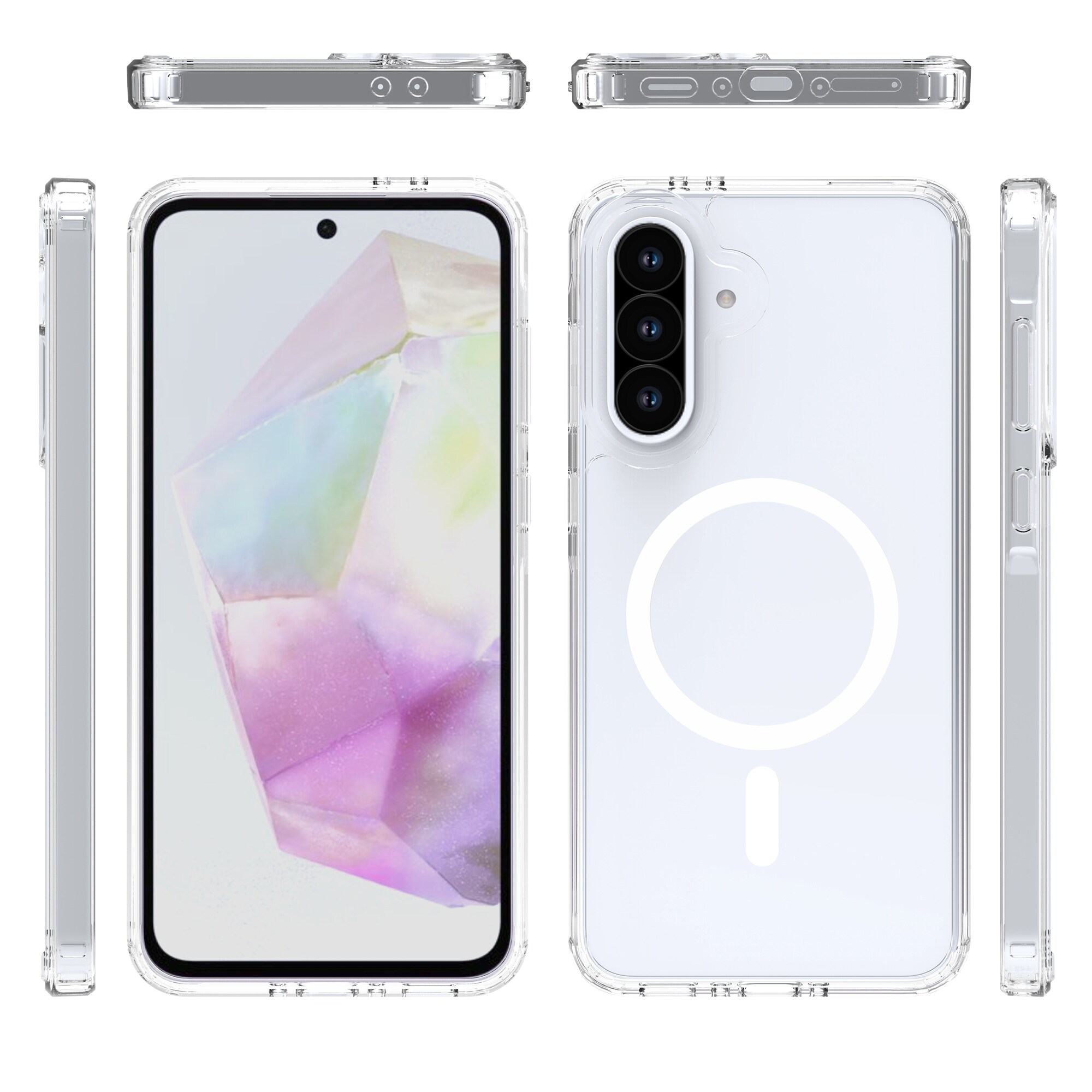 Hybrid case with magnetic ring for Samsung Galaxy A36. For optimal protection against shocks and drops, the case is dual-layered with a TPU core and a hard plastic outer shell. The ring on the back is magnetic and can be used with MagSafe-compatible accessories such as chargers and card holders.