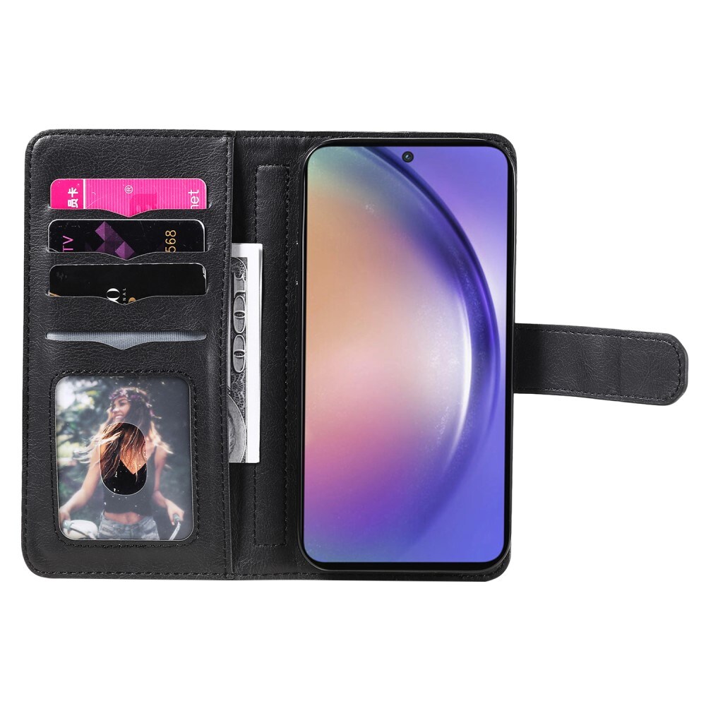 Wallet case for Samsung Galaxy A55 with many card slots, made of faux leather. The wallet case protects the entire phone while allowing you to carry all your cards, cash, and receipts. The case can be converted into a mobile stand for your phone, perfect for watching movies, series, or YouTube. The inner case is attached to the case, providing extra protection for your mobile in case you drop it. The case is secured with a convenient magnetic flap, allowing you to store your phone in a bag without risking your screen getting scratched by other items.