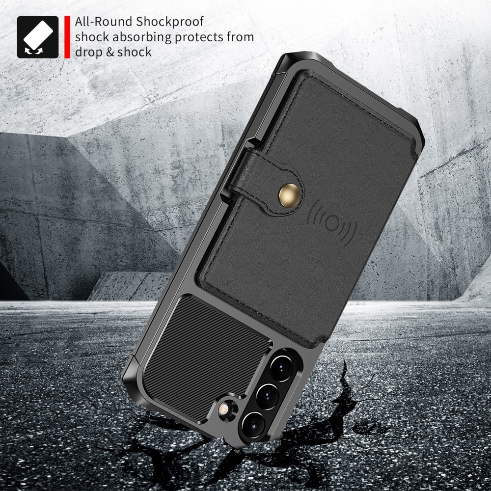 Shock-absorbing phone case with a hidden wallet on the back for Samsung Galaxy S21 FE. The case features a stylish design and reinforced corners for the best protection.