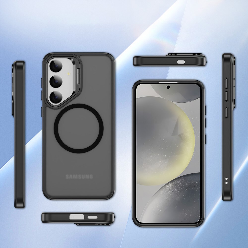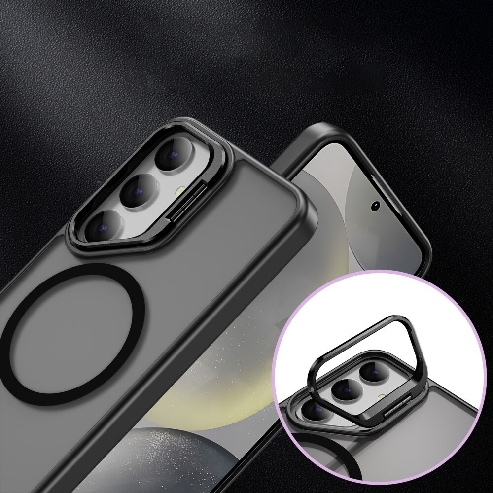 Stylish and practical hybrid case with a foldable kickstand and MagSafe-compatible. For optimal protection against shocks and falls, the case is divided into two parts with a TPU core and a hard plastic shell. The case features a metal frame around the camera that prevents damage to the camera lenses and also can be used as a convenient stand for watching movies, videos, or playing games with a comfortable viewing angle.