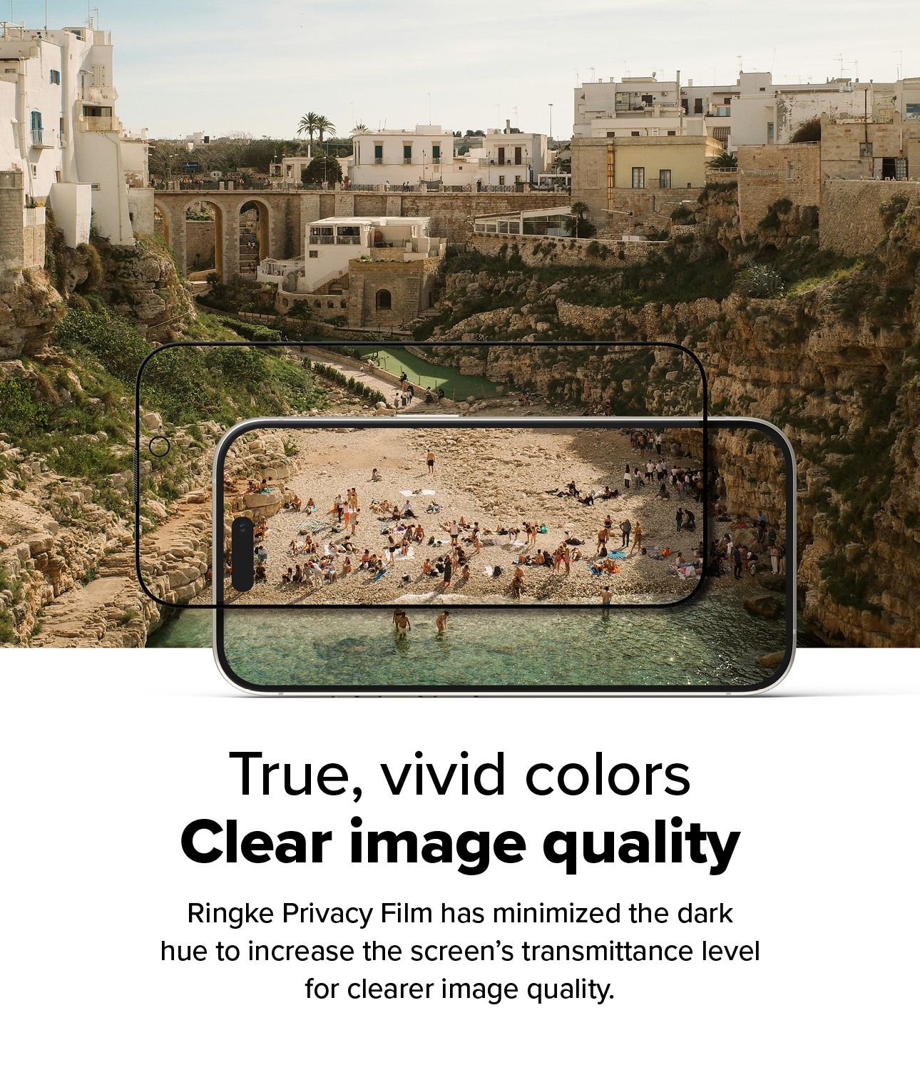2-pack of transparent screen protectors in tempered glass with anti-spy treatment for Apple iPhone 16 Pro from Ringke. The screen protector is made of tempered glass with high hardness, and the privacy treatment makes the content on the screen unclear from a 28° angle. The edges are beveled to avoid sharpness.