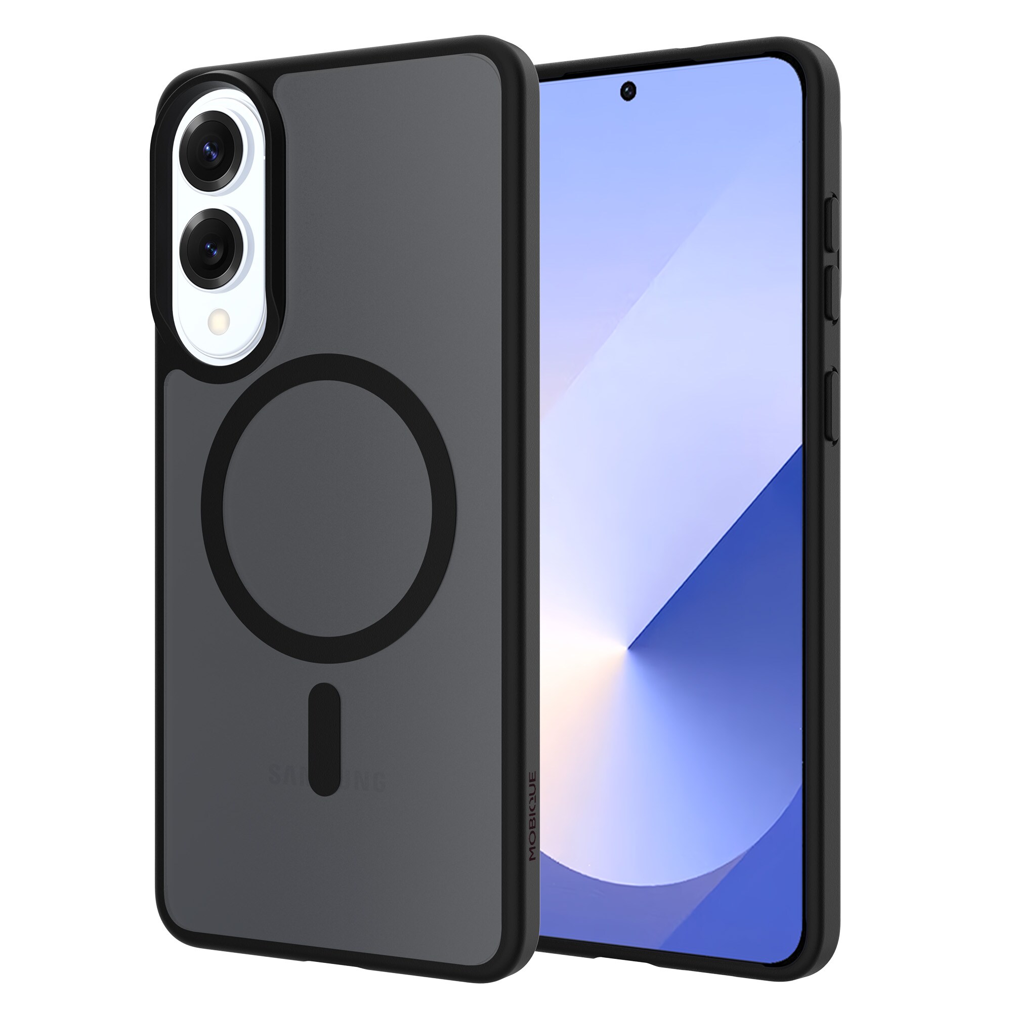 Hybrid case with magnetic ring for Samsung Galaxy S25 Edge from Mobique. The case features a sleek frosted finish and is equipped with a magnetic ring on the back. The ring allows seamless compatibility with MagSafe accessories such as chargers and card holders.