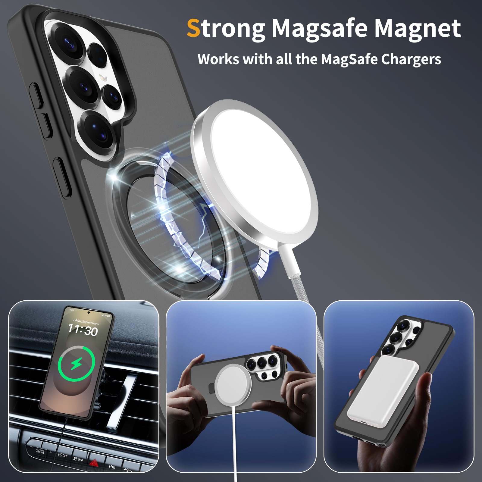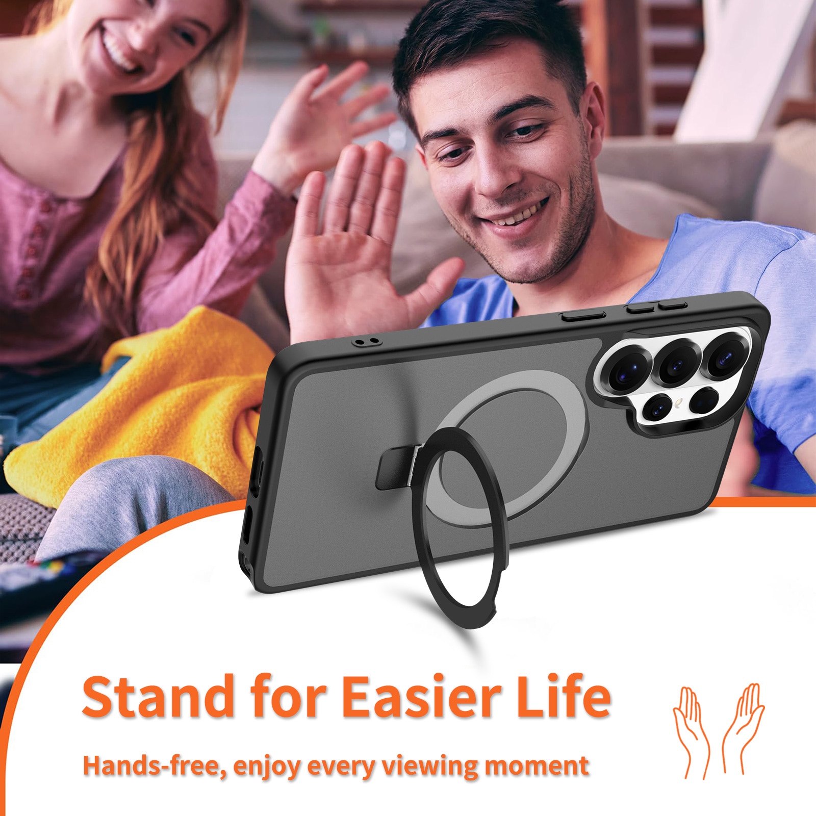 Mobilskal med utfällbar magnetisk ring till Samsung Galaxy S26 Ultra. För bästa skydd mot stötar och fall är skalet tvådelat med en TPU-kärna och ett hölje i hårdplast. Ringen på baksidan är magnetisk och kan användas tllsammans med MagSafe-kompatibla tillbehör såsom laddare och korthållare. Ringen kan även bilda ett ställ för att se på film, klipp eller för att spela.