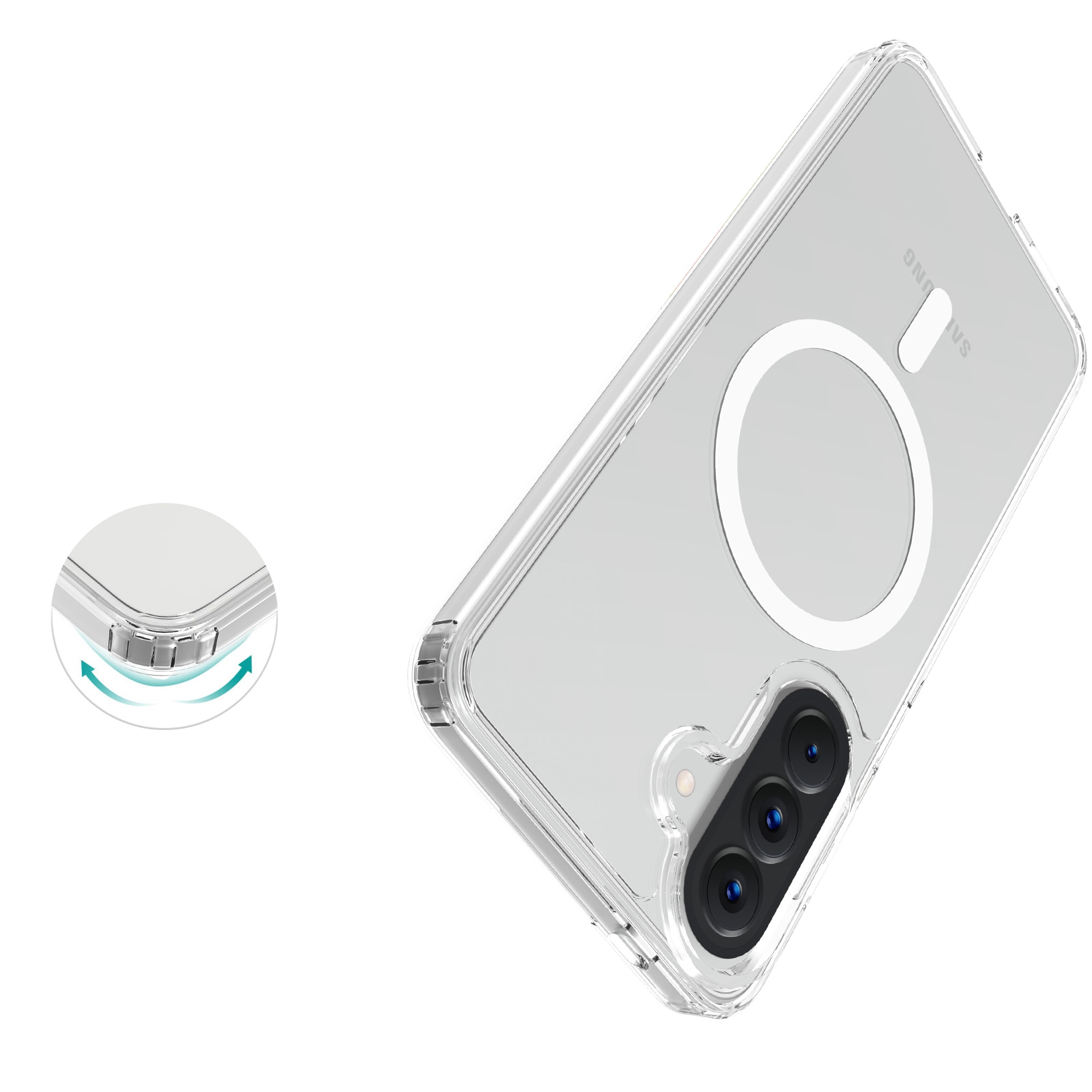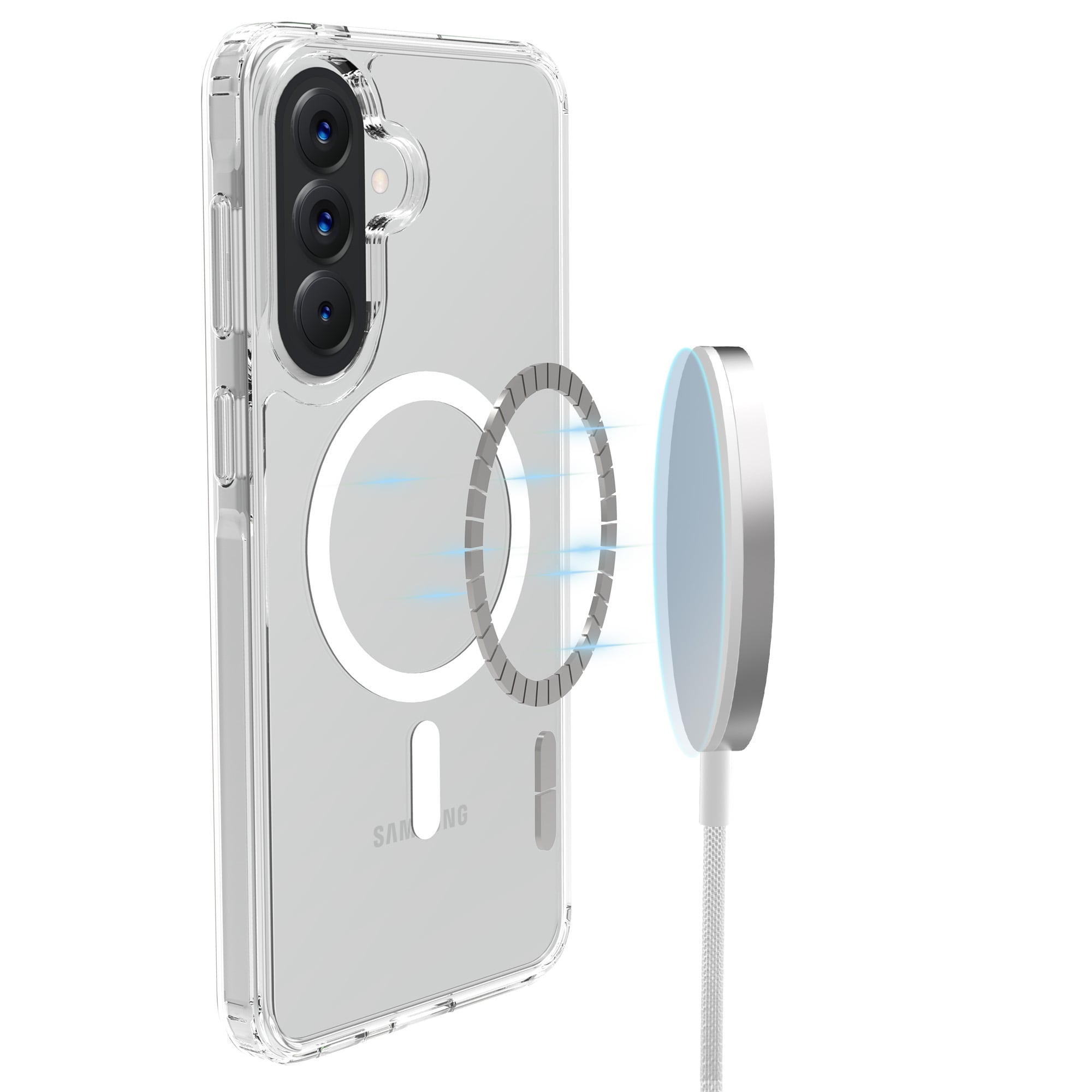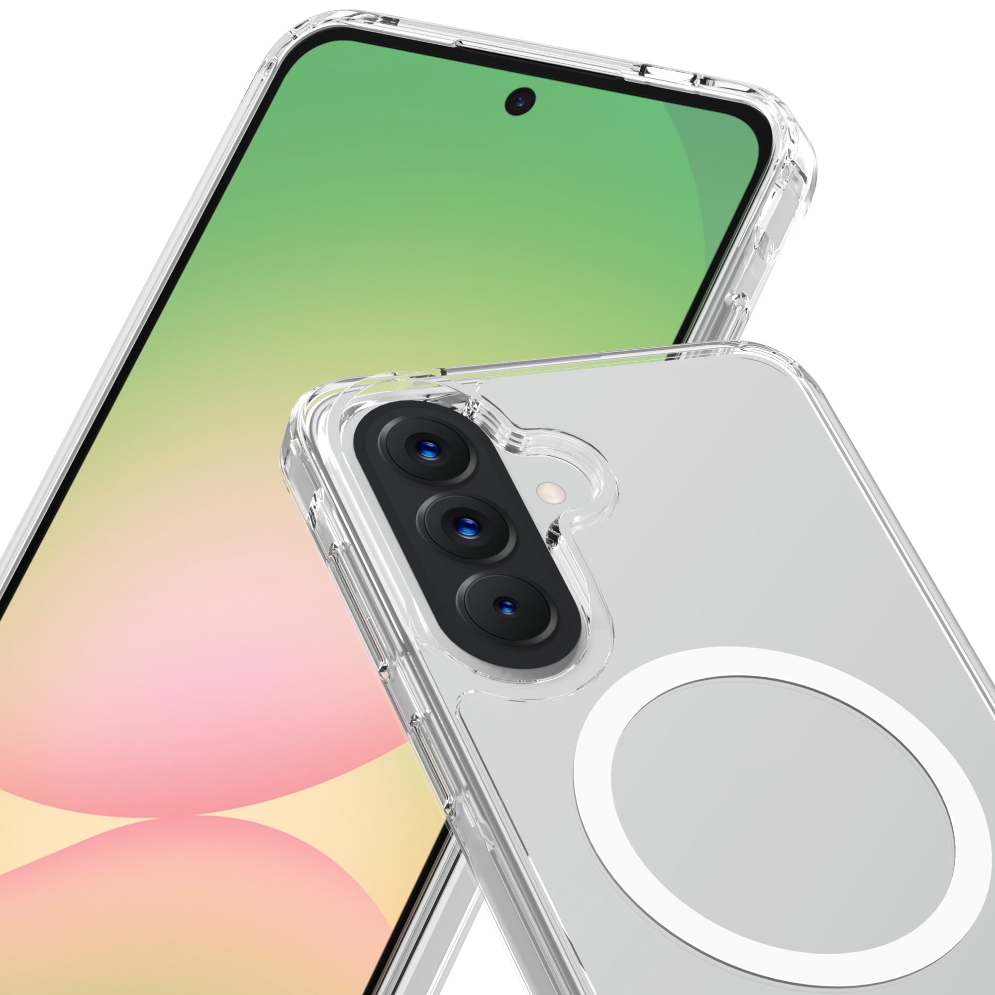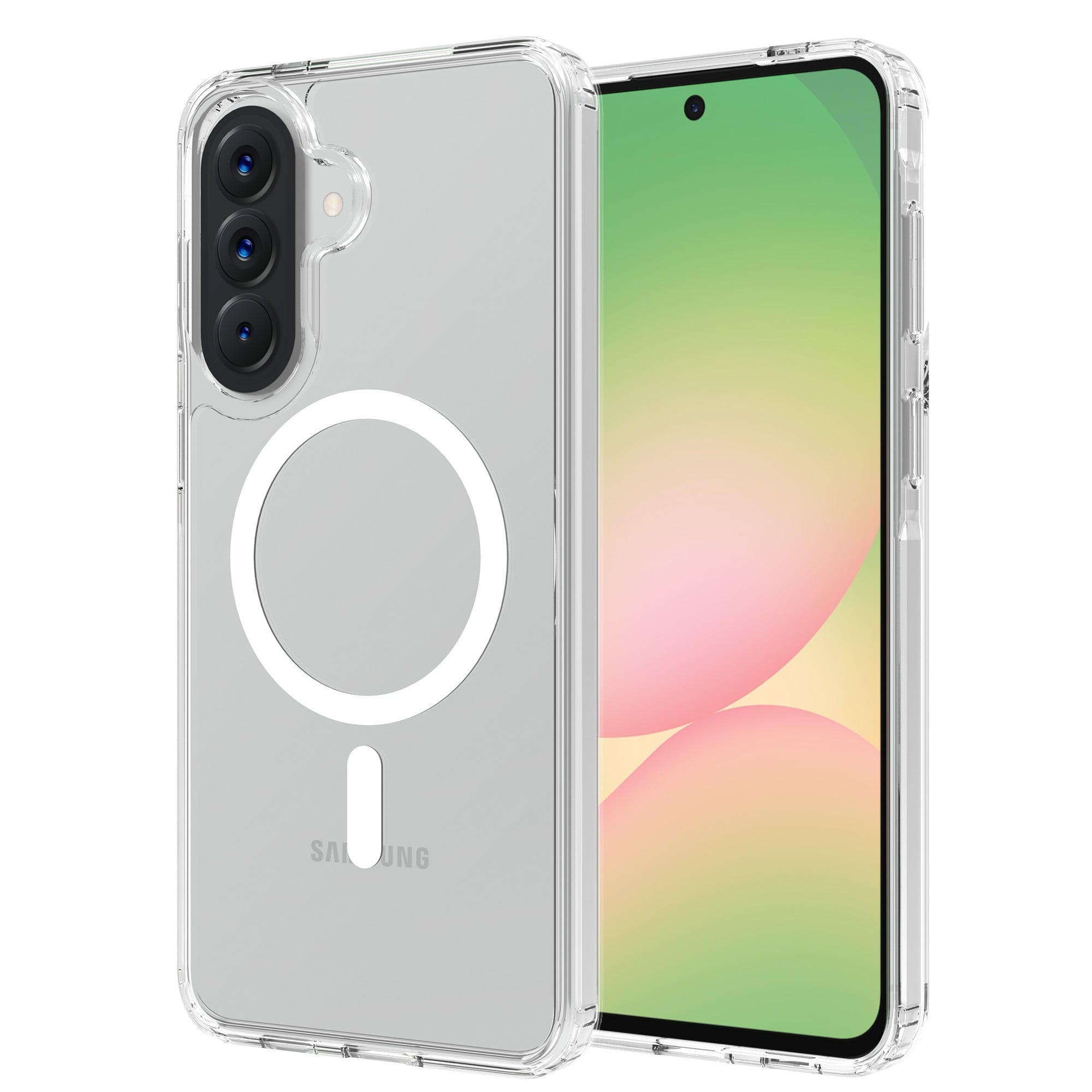 Hybridskal med magnetisk ring till Samsung Galaxy A57. För bästa skydd mot stötar och fall är skalet tvådelat med en TPU-kärna och ett hölje i hårdplast. Ringen på baksidan är magnetisk och kan användas tllsammans med MagSafe-kompatibla tillbehör såsom laddare och korthållare.