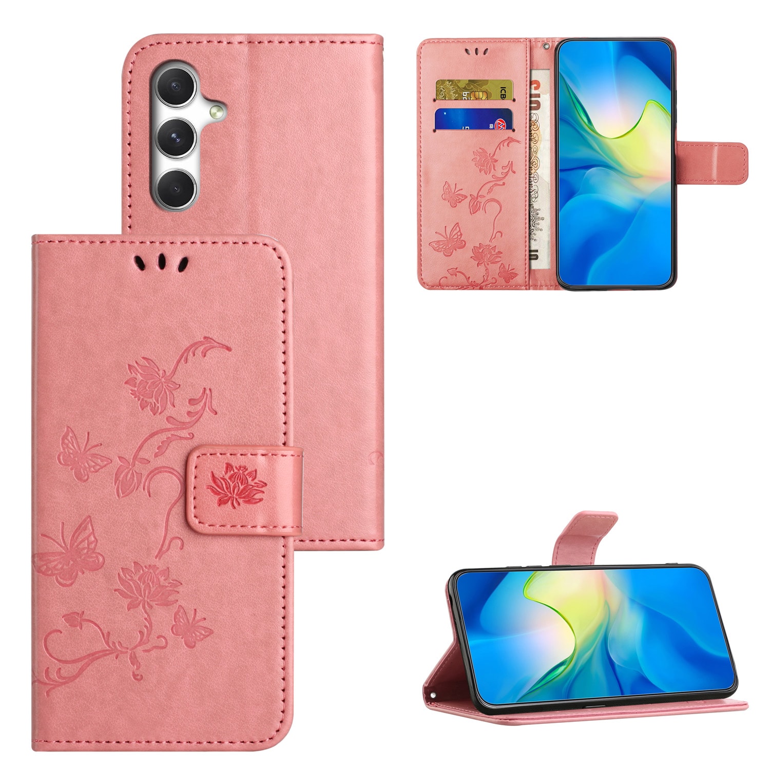 Mobilfodral med fjärilar och mönster stansat i lädret till Samsung Galaxy A57. Plånboksfodralet har ett snyggt utseende och skyddar runt om hela telefonen så att du undviker skador, repor och smuts.