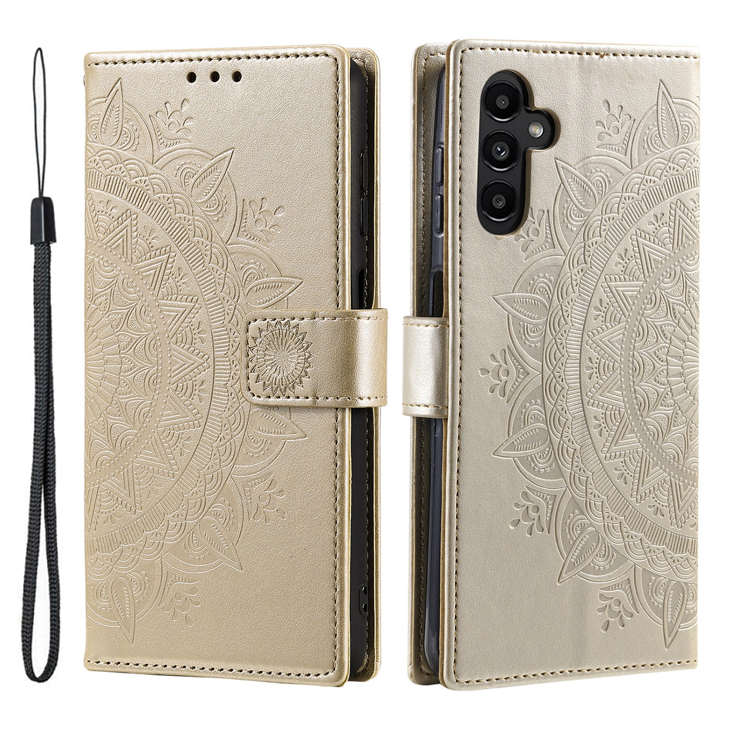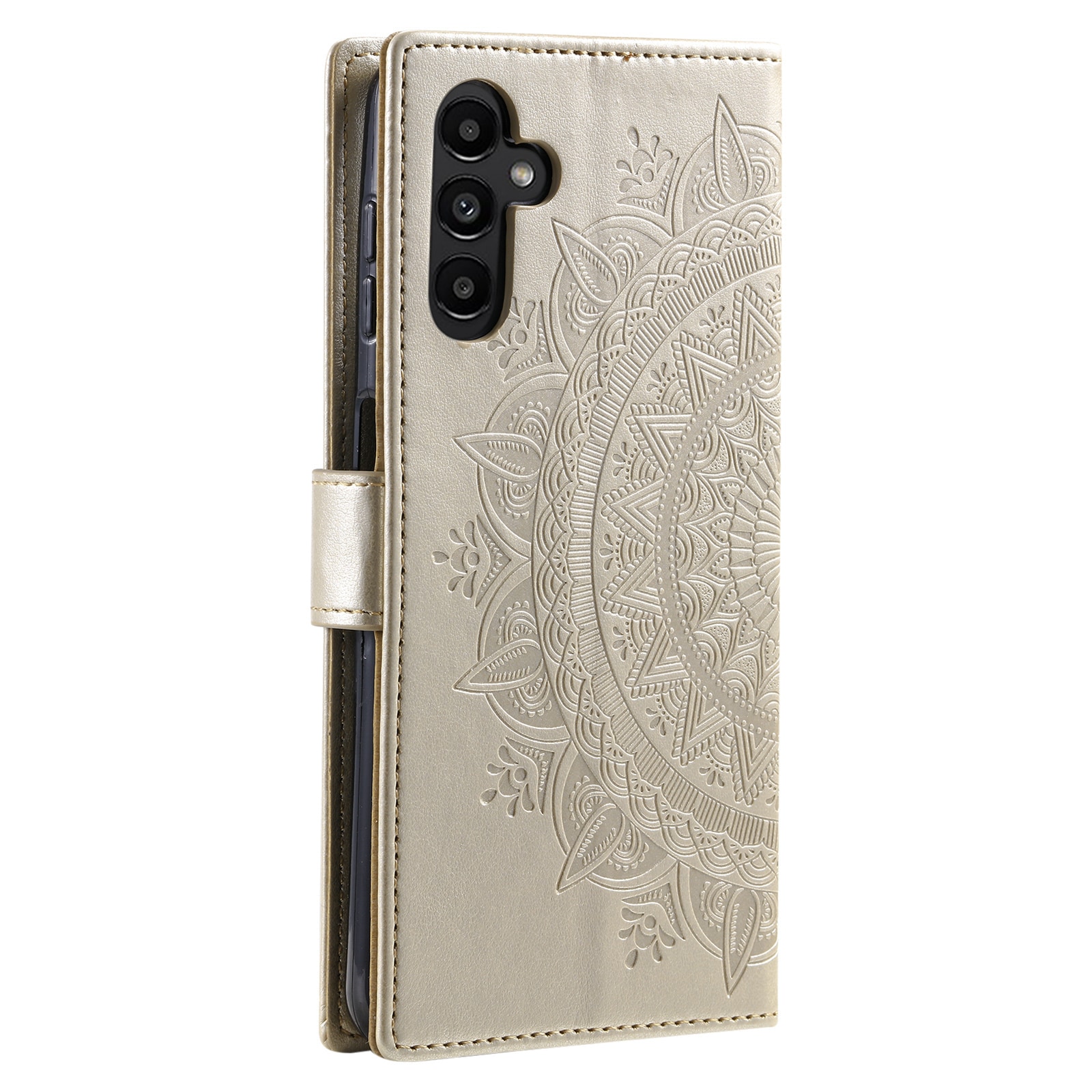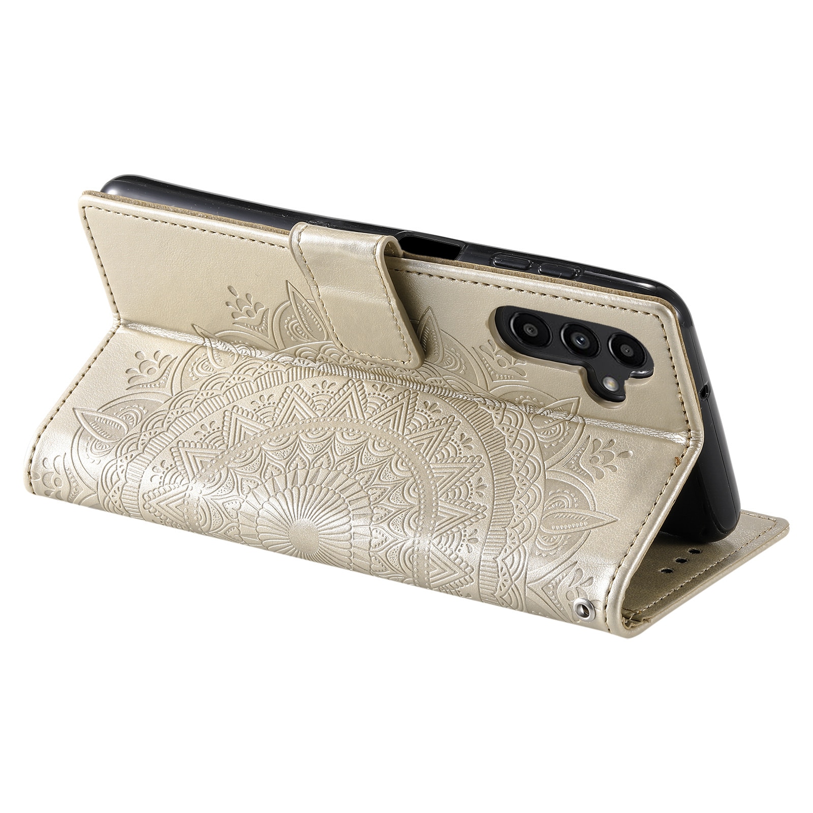 Mobilfodral med mandala och mönster stansat i lädret till Samsung Galaxy A57. Plånboksfodralet har ett snyggt utseende och skyddar runt om hela telefonen så att du undviker skador, repor och smuts.
