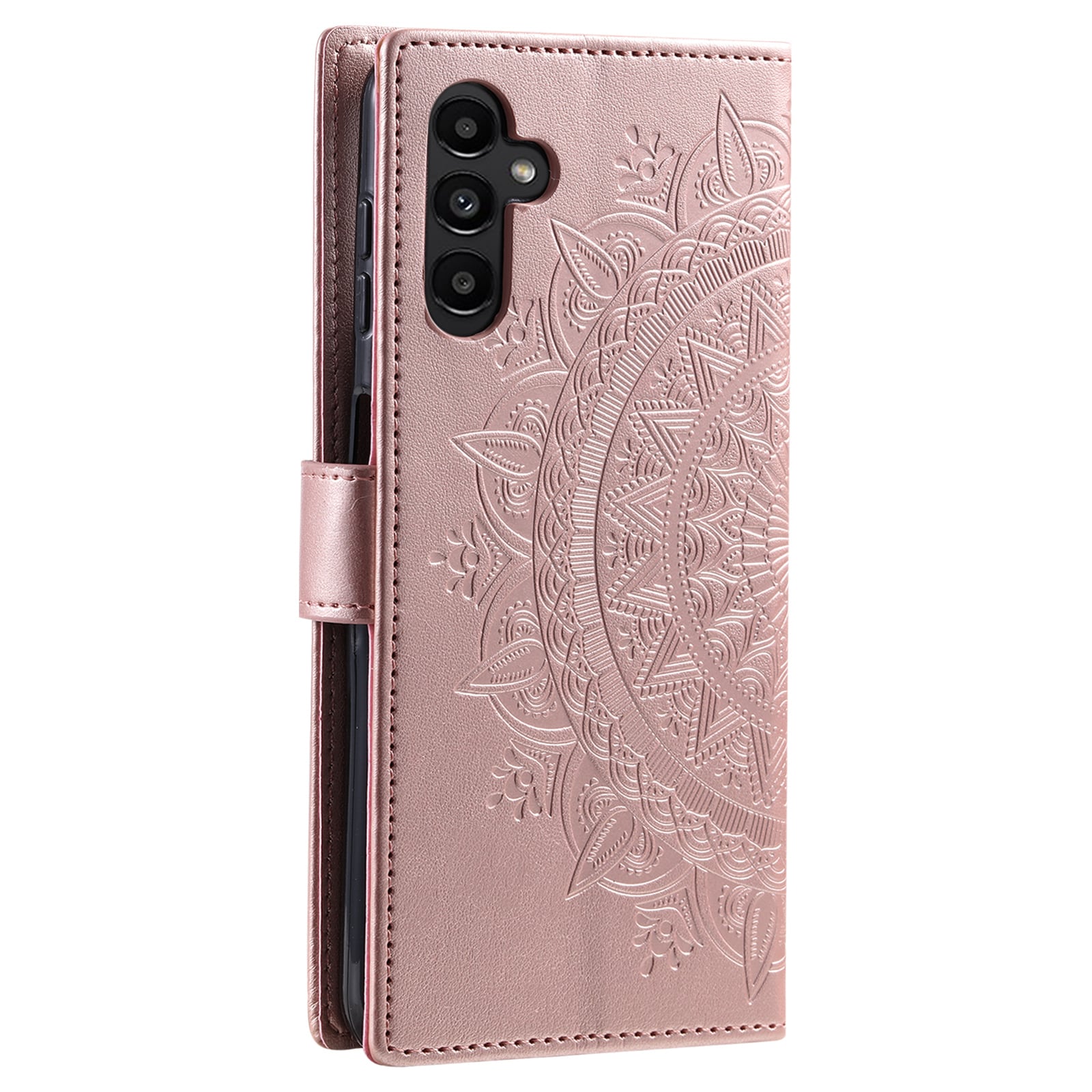 Mobilfodral med mandala och mönster stansat i lädret till Samsung Galaxy A57. Plånboksfodralet har ett snyggt utseende och skyddar runt om hela telefonen så att du undviker skador, repor och smuts.