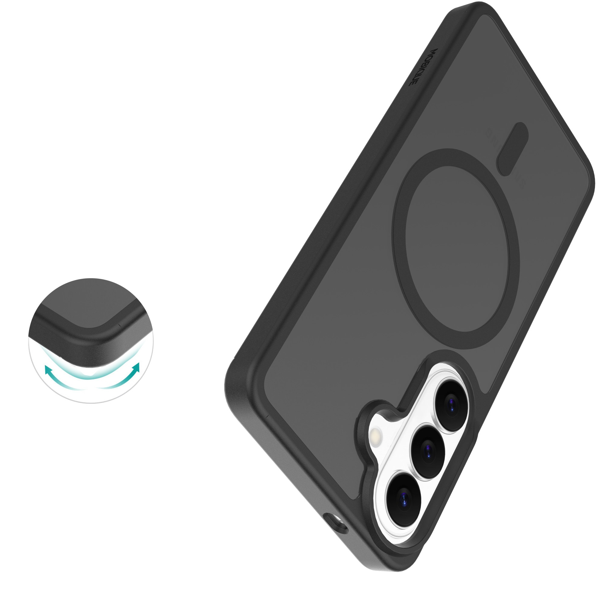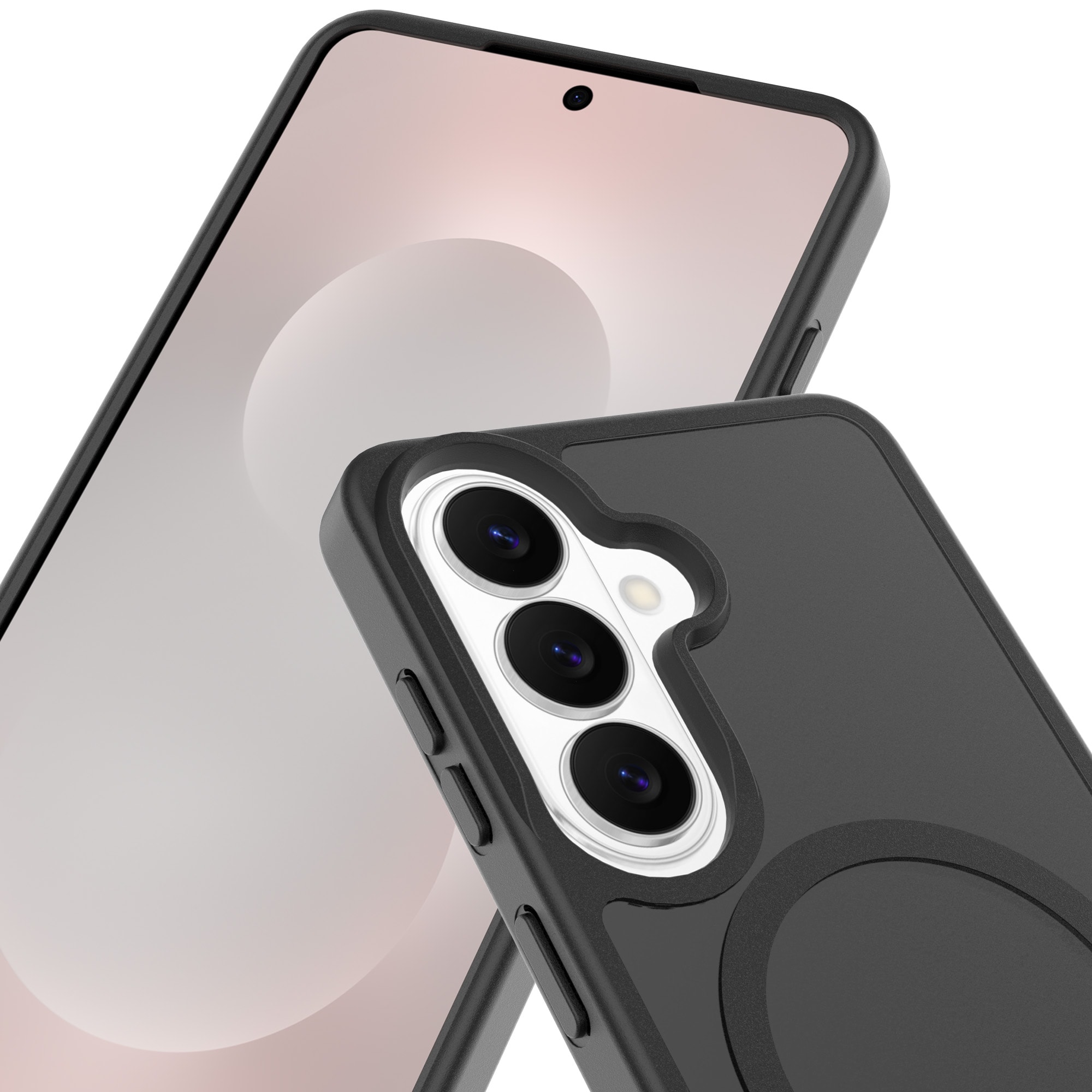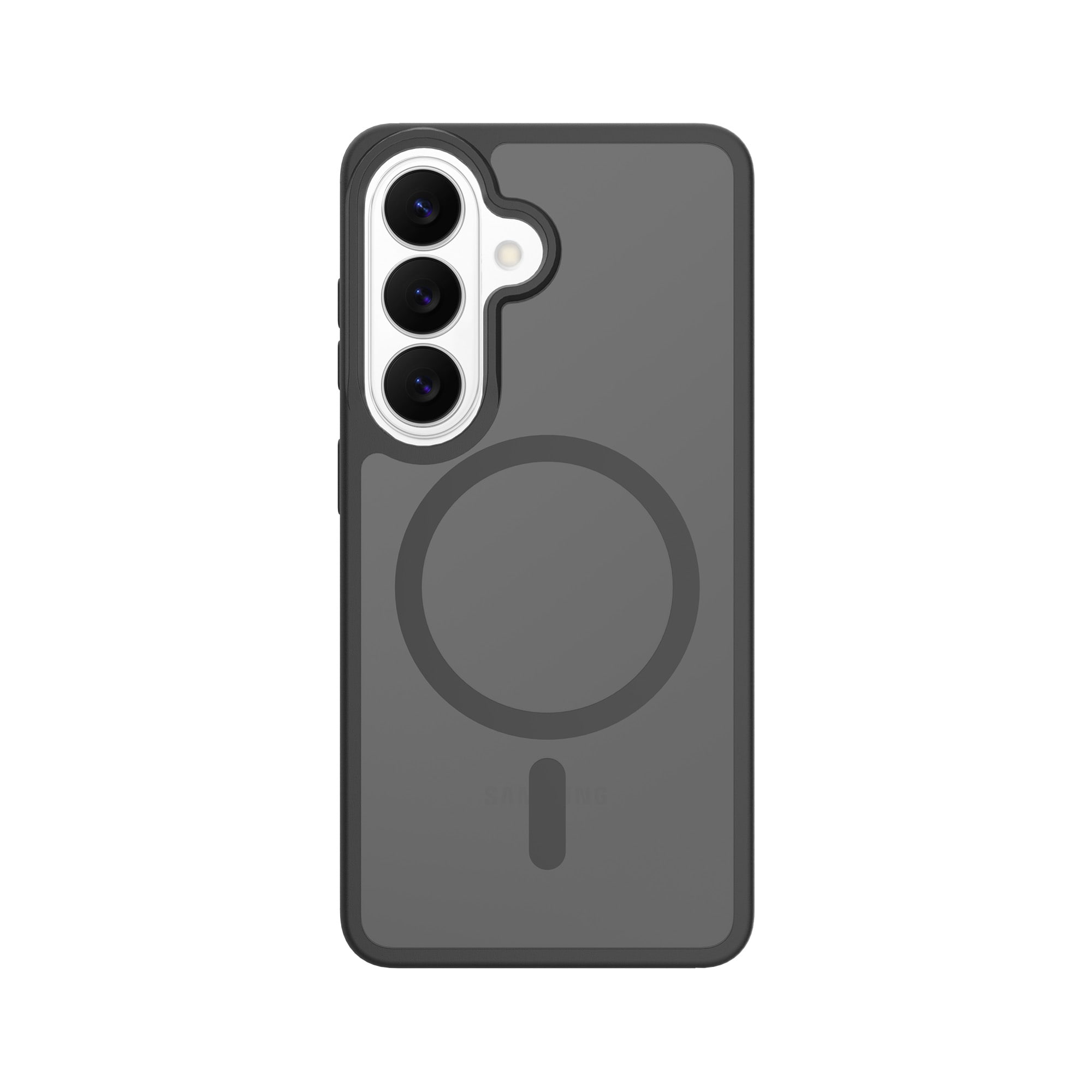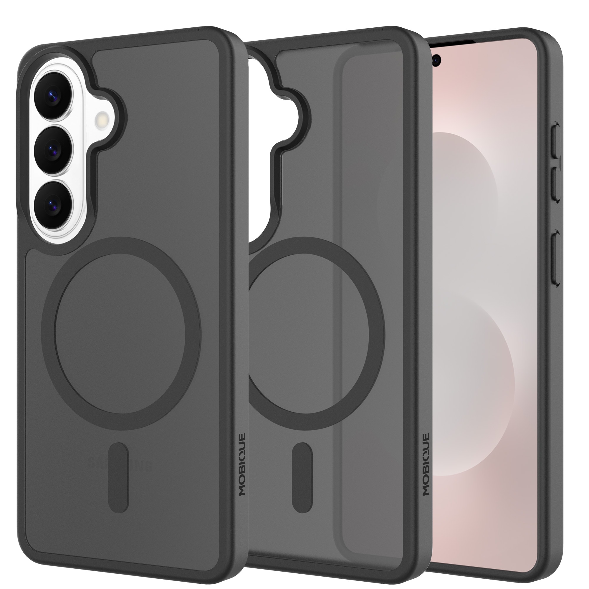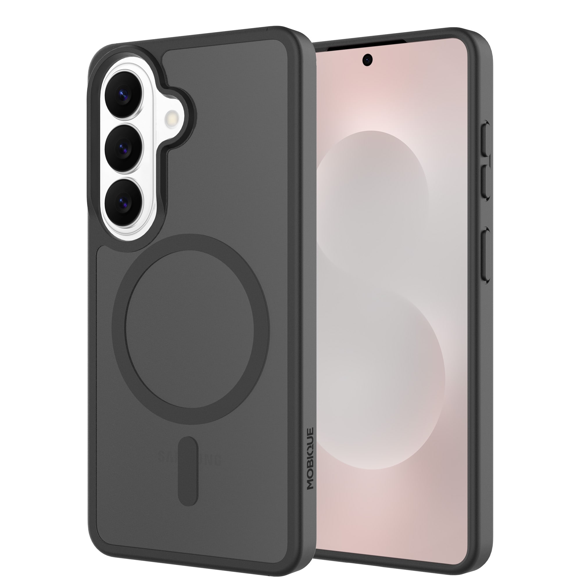 Hybridskal med magnetisk ring för Samsung Galaxy S26 från Mobique. Skalet har en stilren frostad finish och är utrustat med en magnetisk ring på baksidan. Ringen gör det enkelt att använda skalet tillsammans med MagSafe-kompatibla tillbehör, som laddare och korthållare.