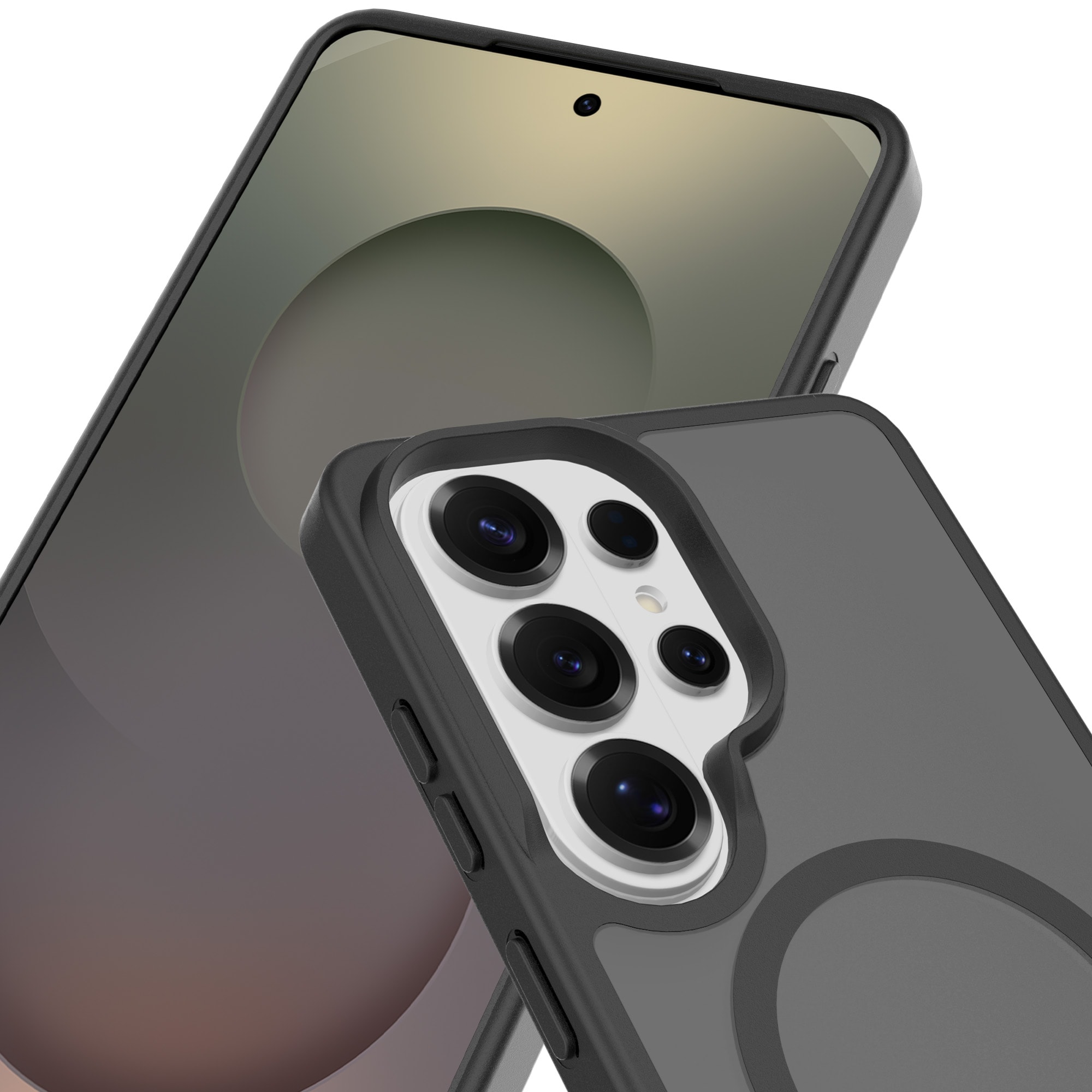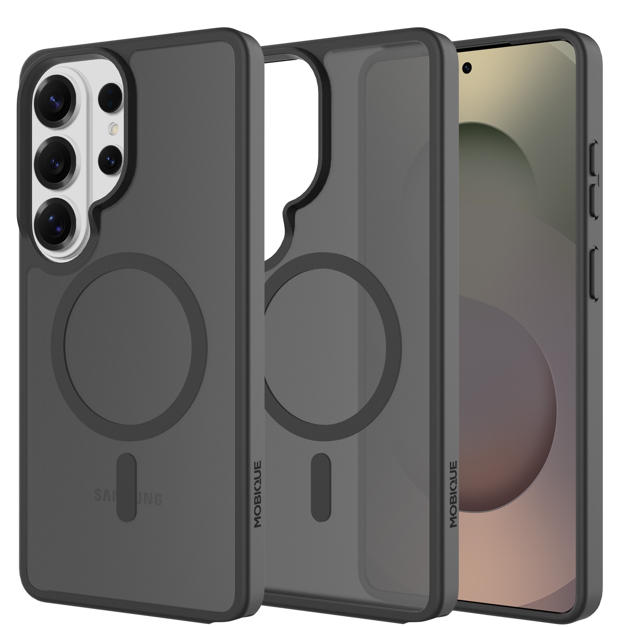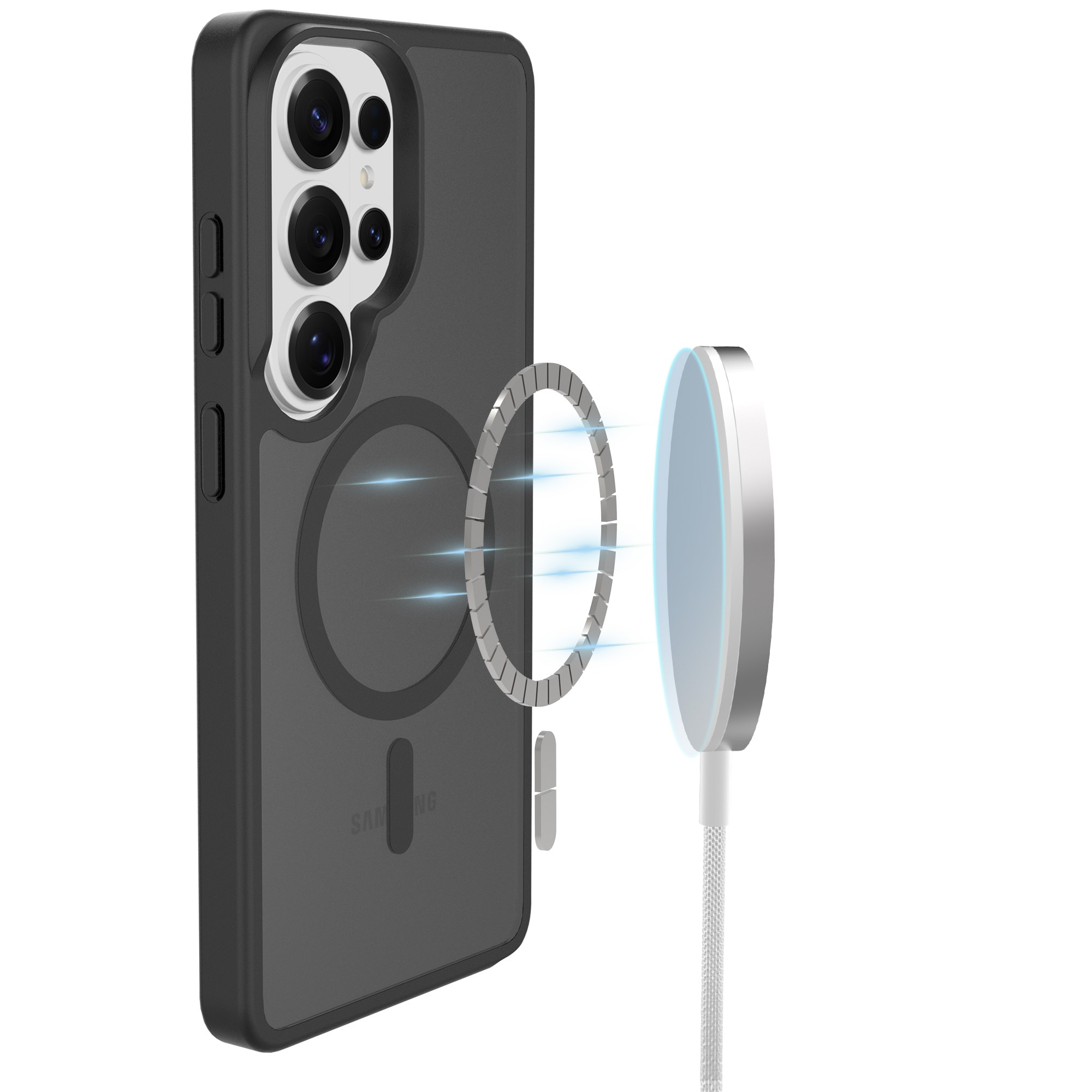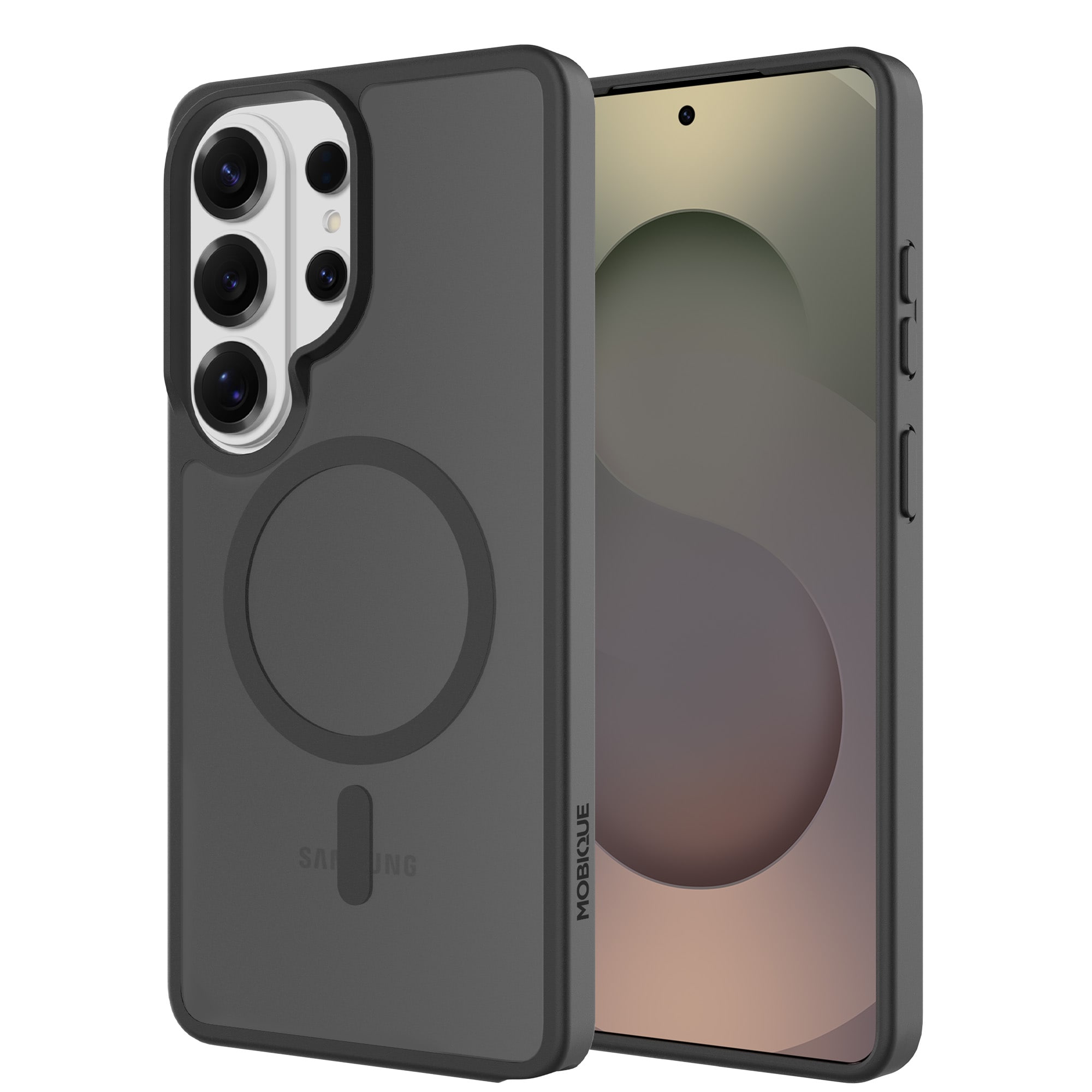 Hybridskal med magnetisk ring för Samsung Galaxy S26 Ultra från Mobique. Skalet har en stilren frostad finish och är utrustat med en magnetisk ring på baksidan. Ringen gör det enkelt att använda skalet tillsammans med MagSafe-kompatibla tillbehör, som laddare och korthållare.