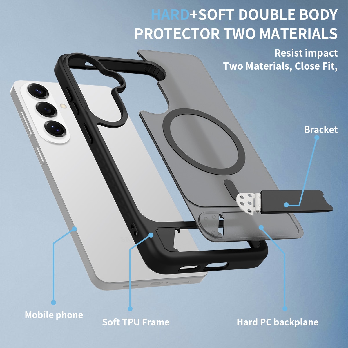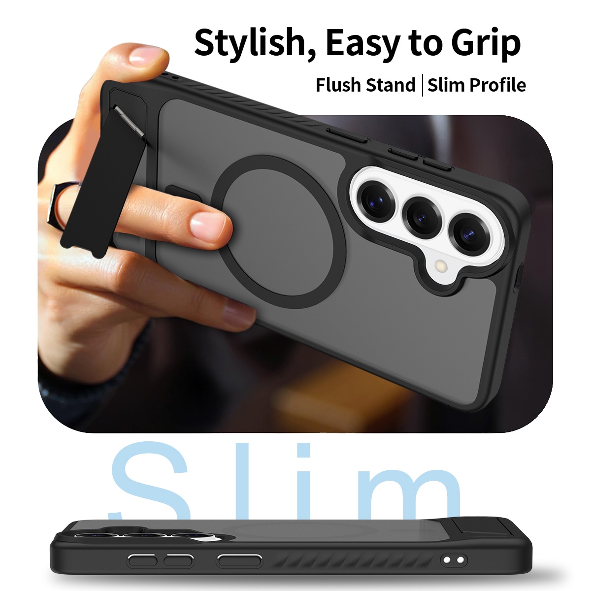 Snyggt och praktiskt hybridskal med inbyggt ställ för Samsung Galaxy S26 Plus. Skalet skyddar din telefon mot stötar och repor med en slitstark kombination av hårdplast och flexibel TPU. Det utfällbara stället gör det enkelt att titta på film, klipp eller spela handsfree.
