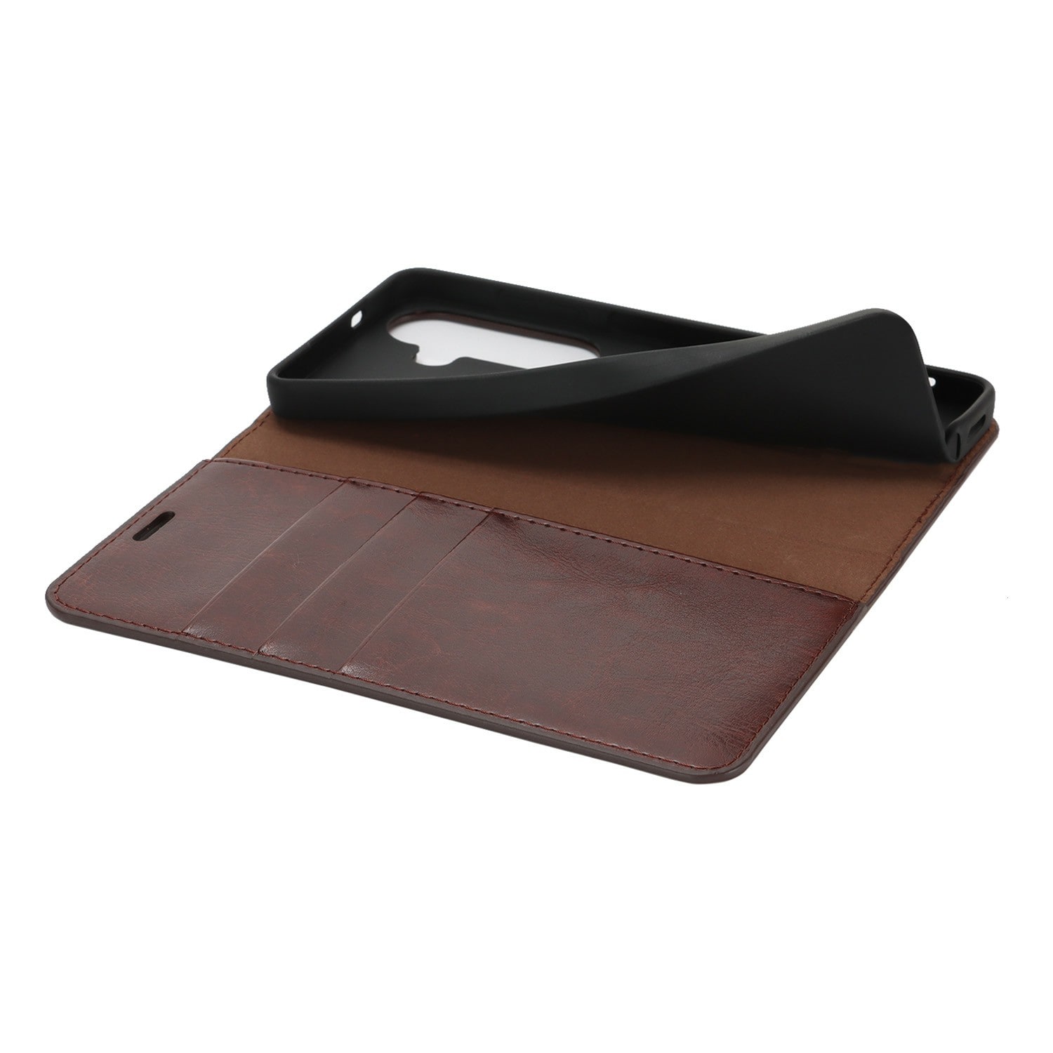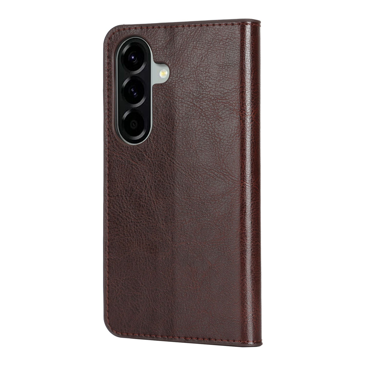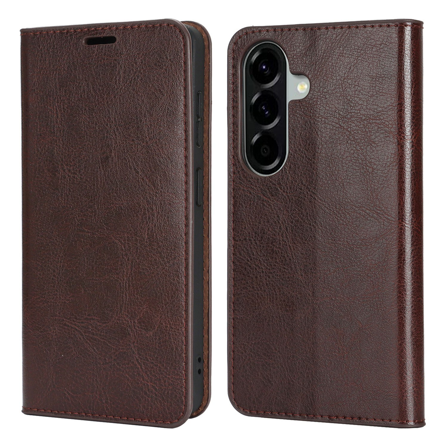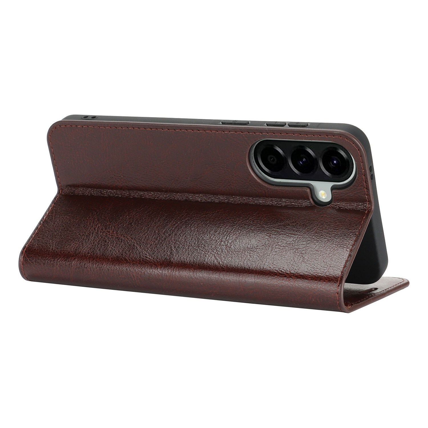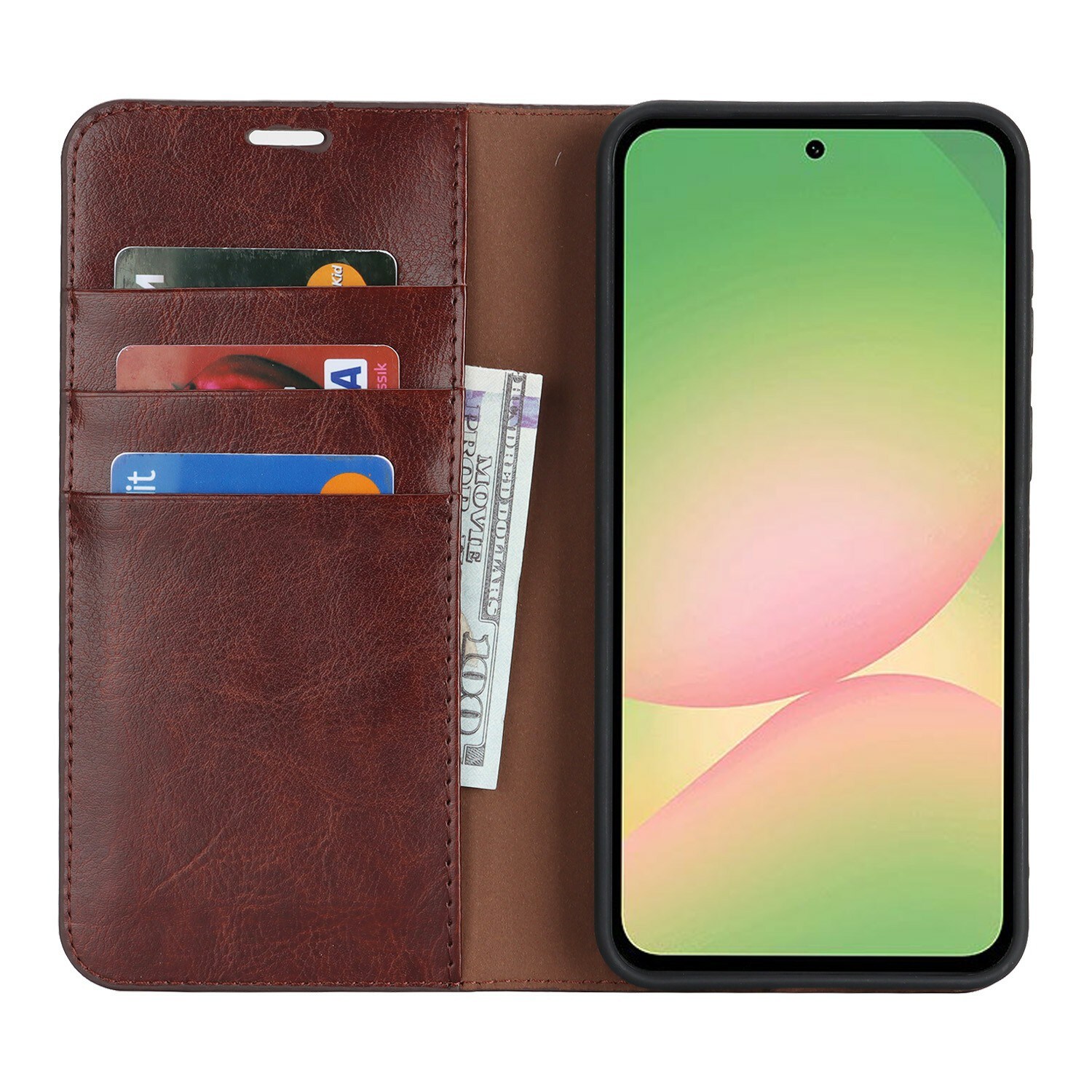 Skydda din Samsung Galaxy A57 med ett fodral i äkta läder. Trots sin tunna och smarta design har fodralet 3 stycken kortfack och 1 sedelfack på insidan av locket. Telefonen klickas i ett flexibelt skal för att sitta säkert fast i fodralet.