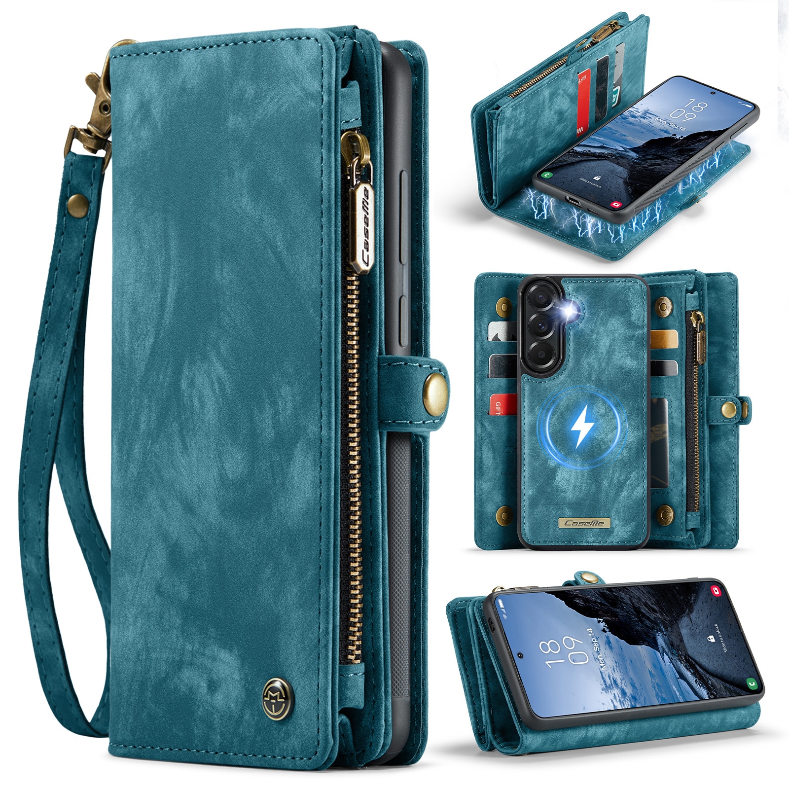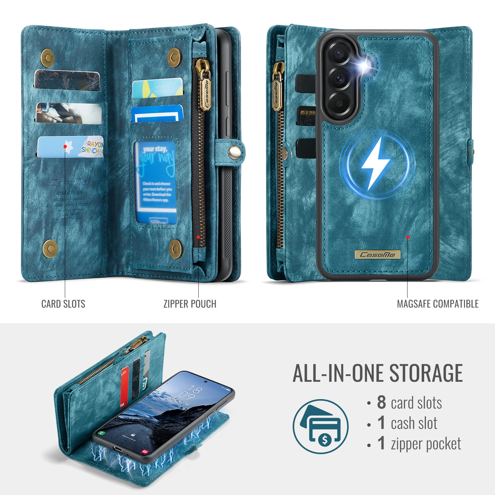 Mobilfodral med magnetskal och plånbok med extra många kortplatser till Samsung Galaxy A57 från CaseMe. Den rymliga plånboken har sedelficka, myntfack med dragkedja och ett flertal kortfack.