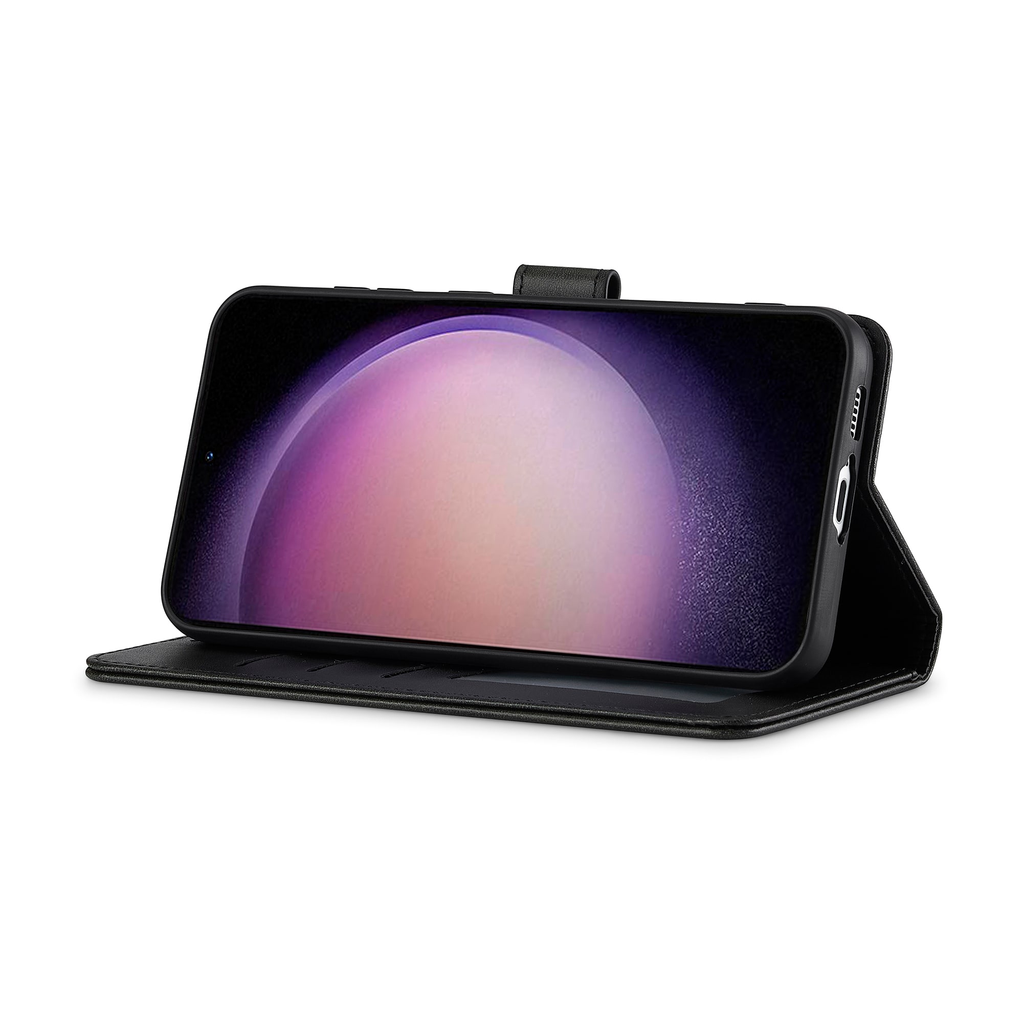 Plånboken på insidan av locket har tre kortfack och en sedelficka. Locket som stängs över skärmen hålls stängt med ett magnetlås. Locket kan även bilda ett mobilställ när du vill se på film, serier eller klipp.