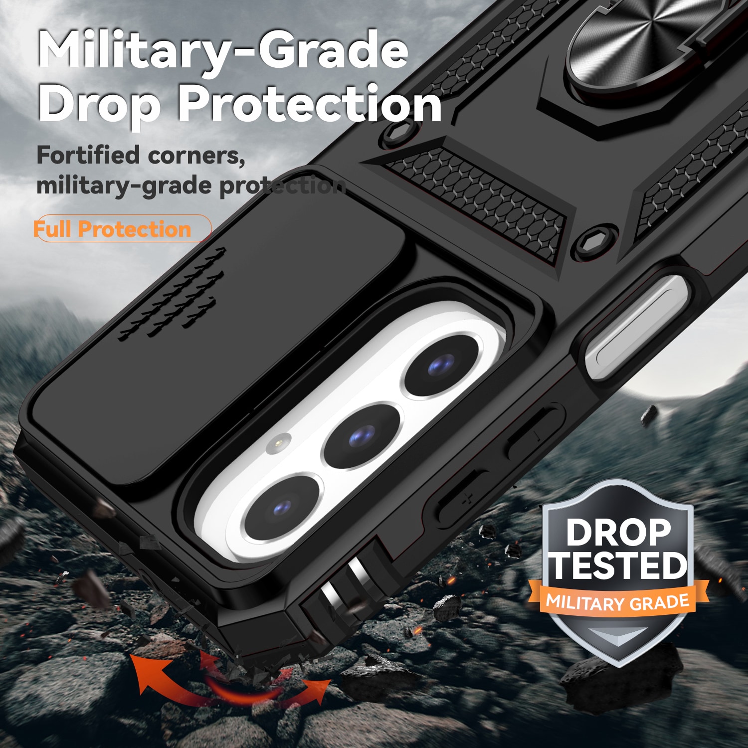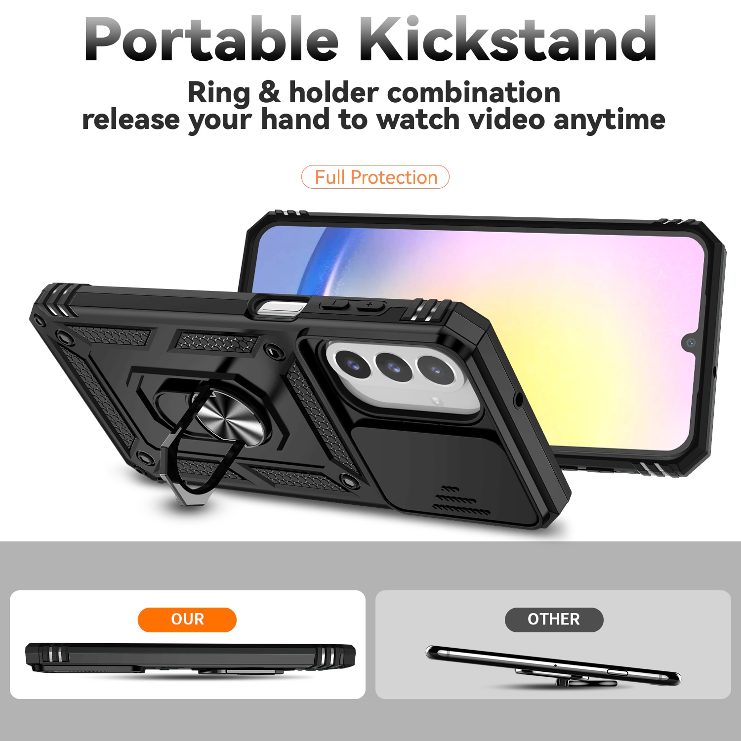 Hybrid case with foldable ring for Samsung Galaxy A17. For optimal protection against drops and impacts, the case features a three-part design with a TPU core, a hard plastic shell, and a protective frame around the screen. The ring on the back can be folded out to provide a secure grip on the phone. It can also be used as a stand for watching movies, videos, or playing games.