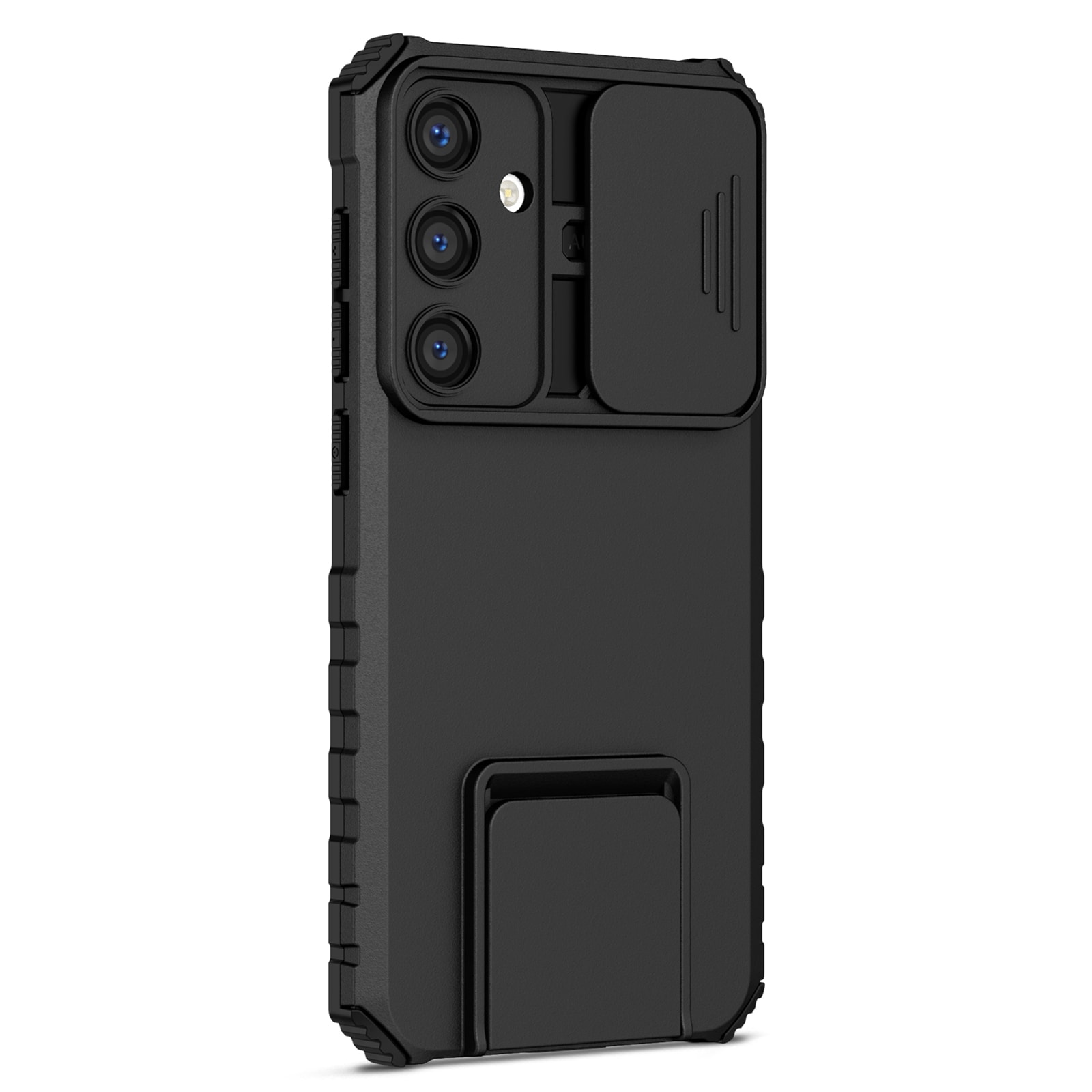 Robust skal till Samsung Galaxy A57 med inbyggt kameraskydd och stativ. Skalet har en tvålagerskonstruktion som består av en ram i flexibel TPU och ett yttre hölje i hårdplast. Kanterna är förstärka för att skalet effektivt ska dämpa vid fall och stötar.