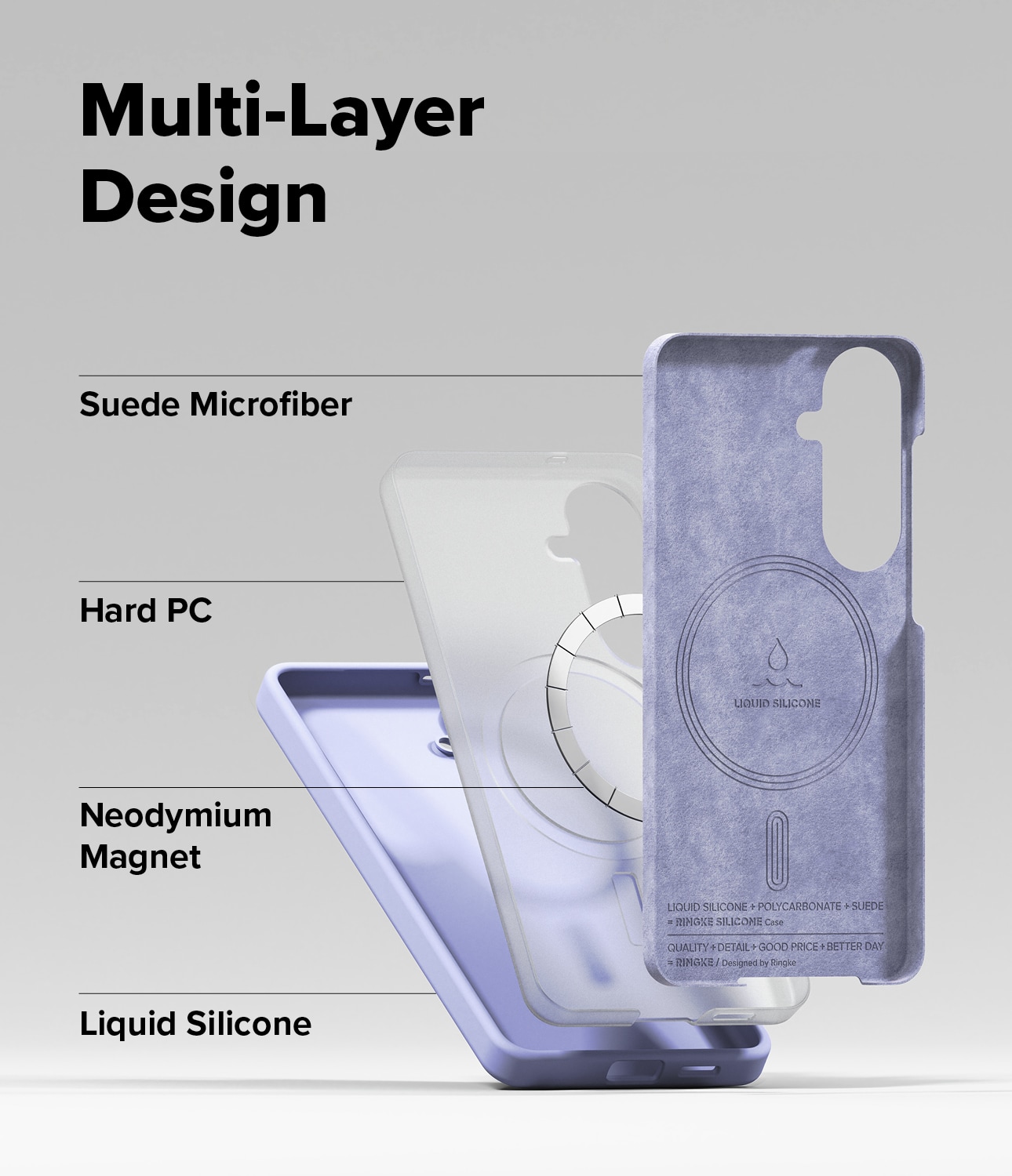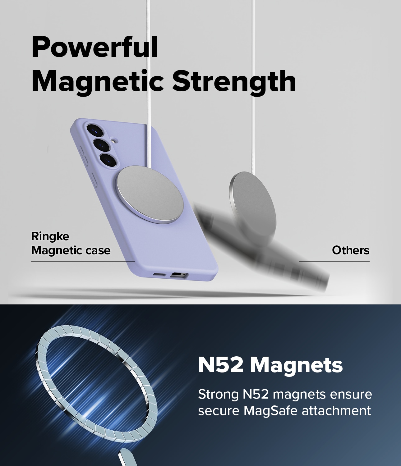 Stilrent silikonskal med MagSafe från Ringke till Samsung Galaxy S26. Skalet är stötdämpande för att skydda mot skador och MagSafe-stödet gör att du kan använda MagSafe-tillbehör och MagSafe-ladda med skalet på.