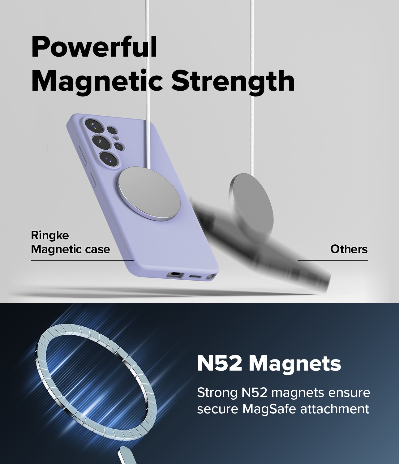 Stilrent silikonskal med MagSafe från Ringke till Samsung Galaxy S26 Ultra. Skalet är stötdämpande för att skydda mot skador och MagSafe-stödet gör att du kan använda MagSafe-tillbehör och MagSafe-ladda med skalet på.
