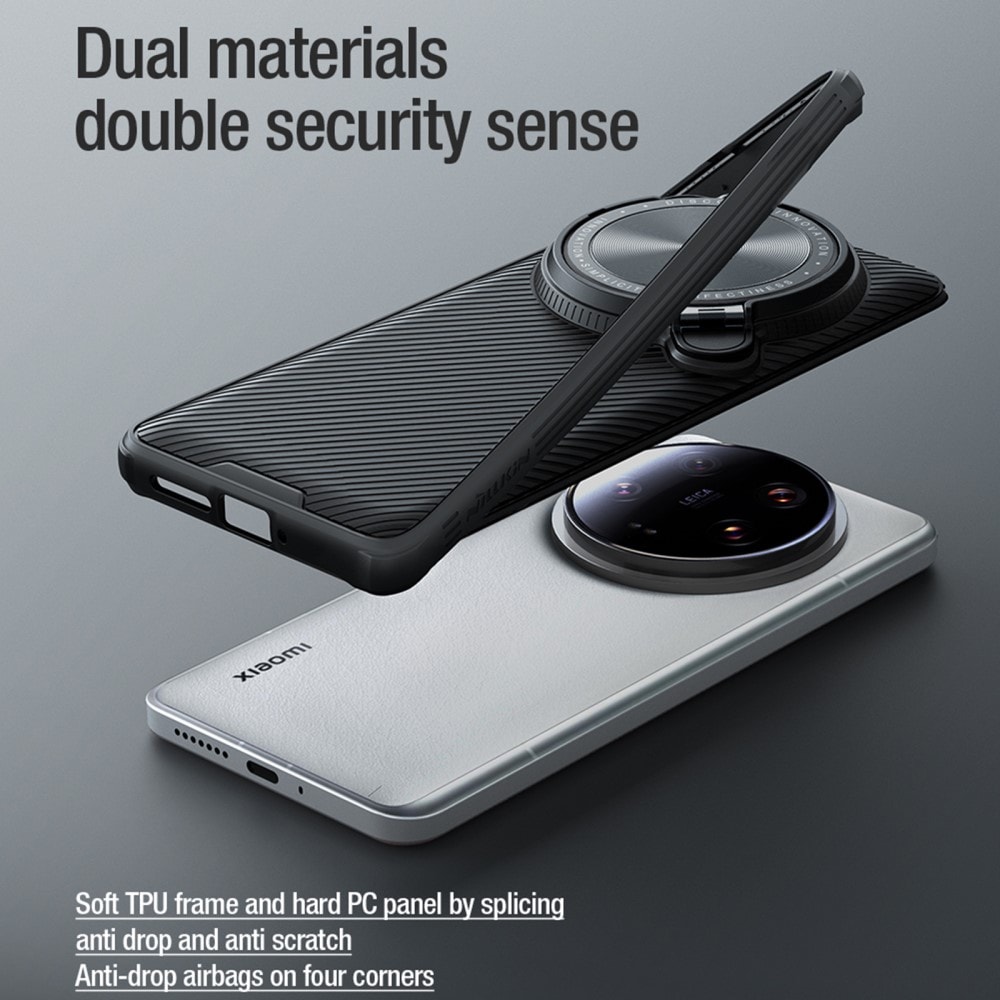 Protective and functional case with camera protection for Xiaomi 14 Ultra from Nillkin. The case features a metal cover in front of the camera, protecting the lenses from scratches and damage. Additionally, the camera protection doubles as a convenient stand to prop up your phone, perfect for hands-free viewing of videos and video calls.