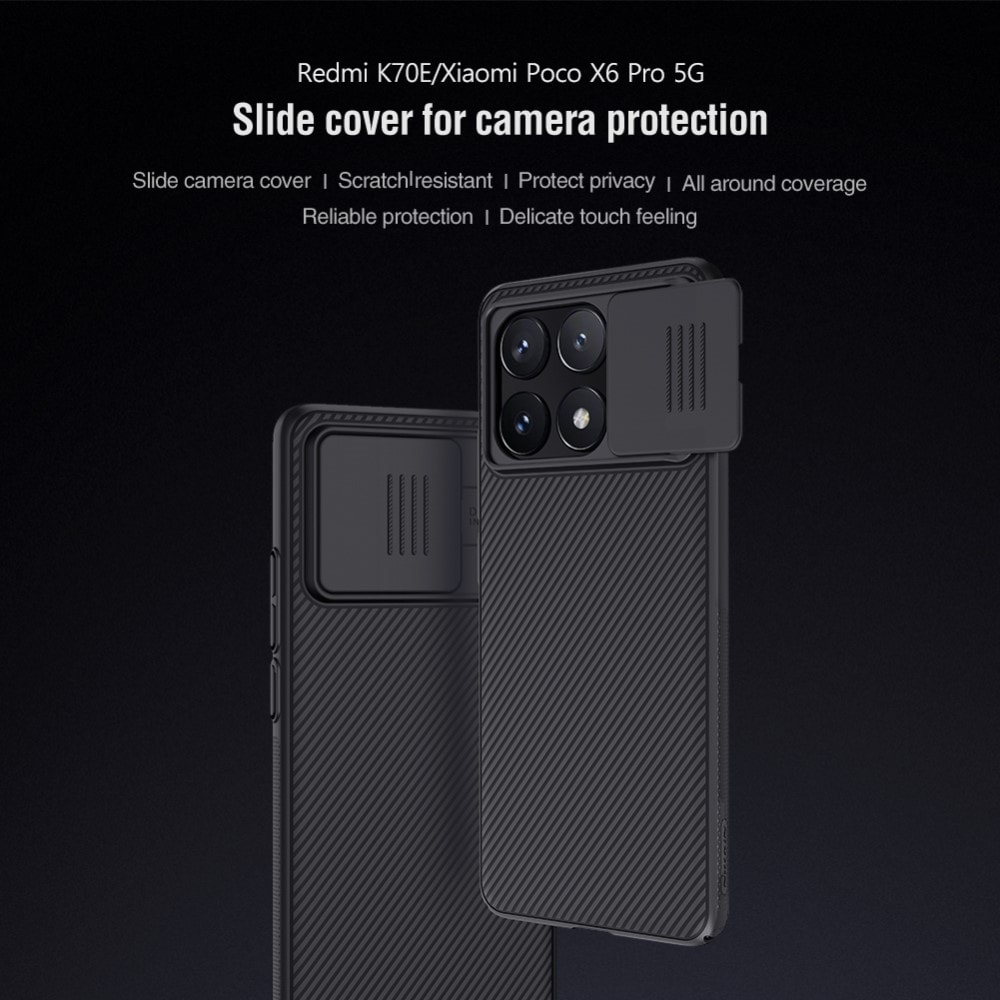 Protective case with camera cover and stylish design for Xiaomi Poco X6 Pro from Nillkin. This case protects your camera from scratches and damage with a practical sliding cover that can easily be moved over the camera when not in use.