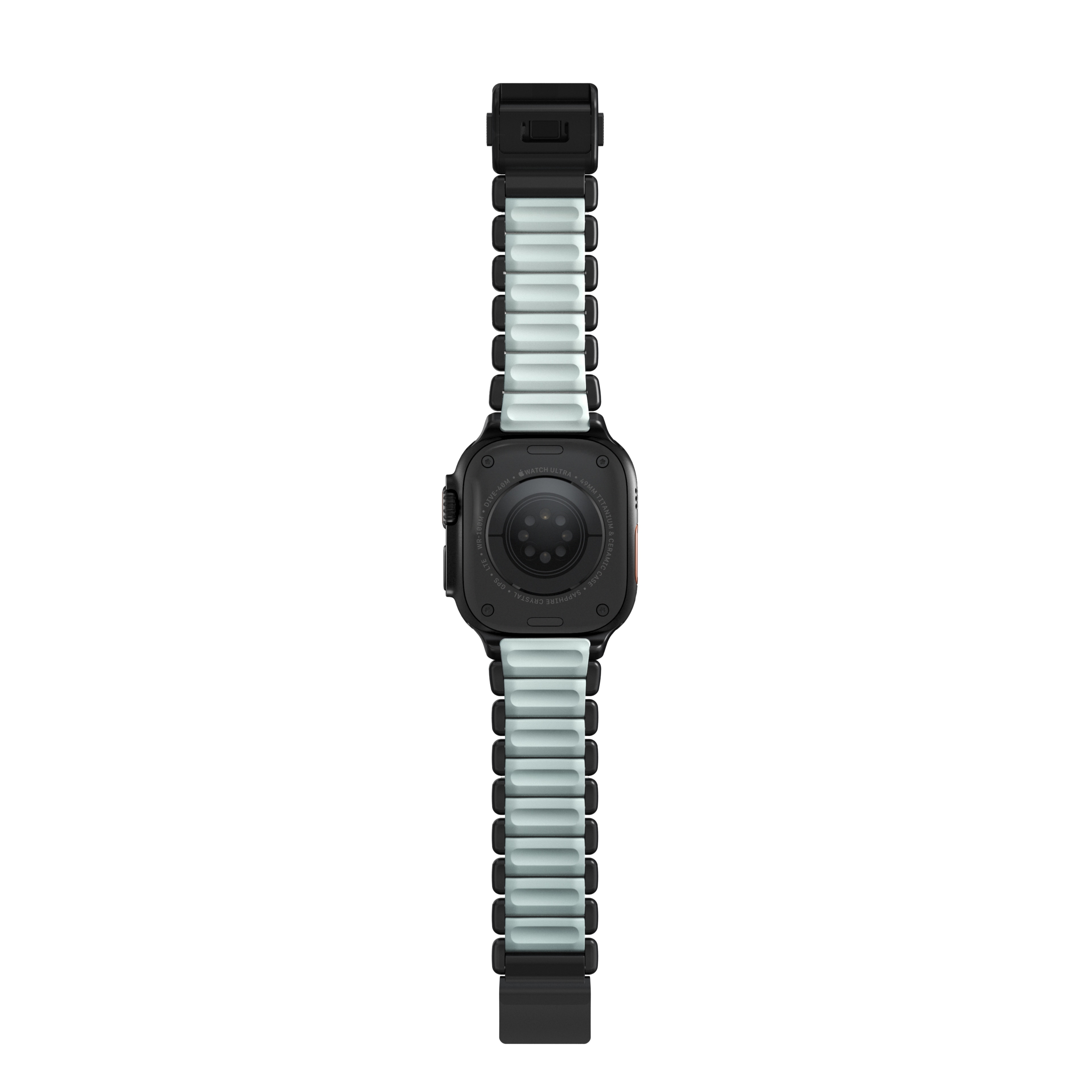 Stratos Band till Apple Watch Series 11 46mm kombinerar slitstarkt titan med högkvalitativt FKM-gummi för ett armband som passar lika bra till vardag som till äventyr. Det är vattentåligt, bekvämt att bära hela dagen och skyddat mot repor tack vare en tålig beläggning. De flexibla länkarna följer handleden naturligt, medan det magnetiska spännet gör att armbandet sitter säkert och bekvämt.